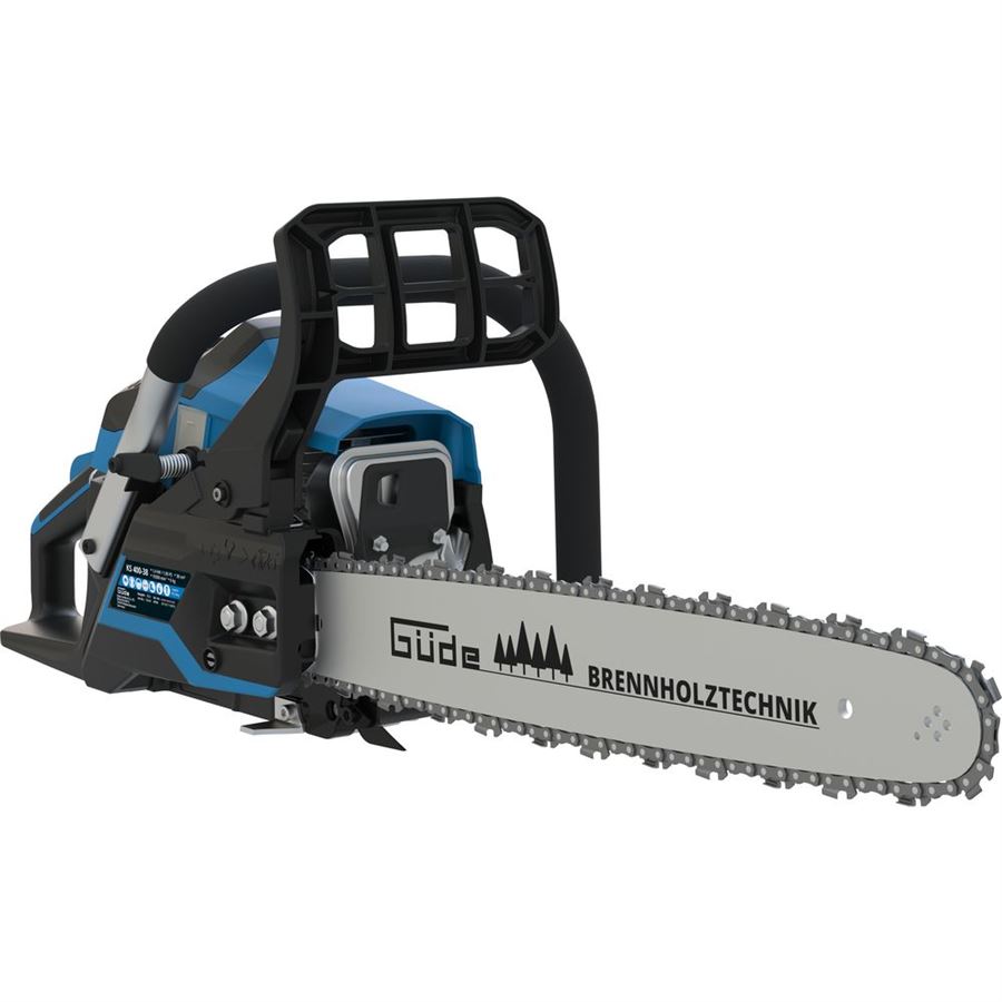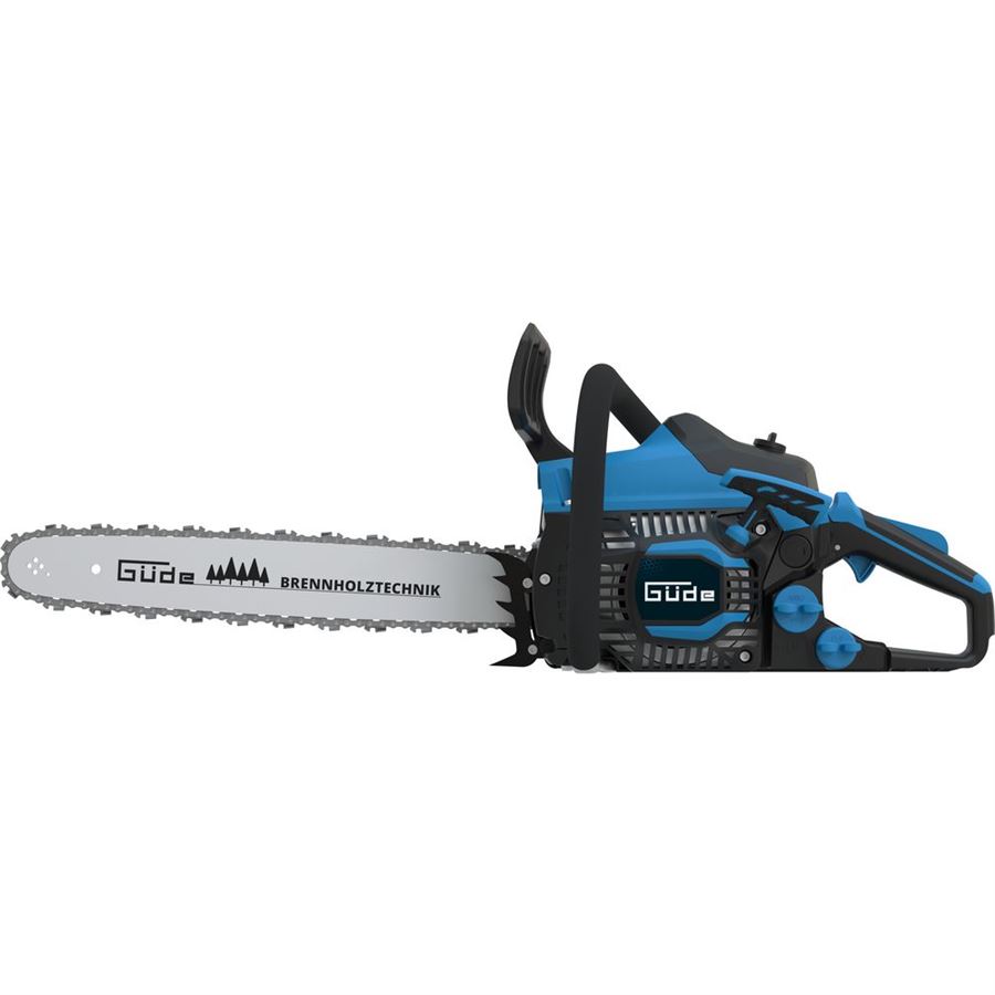Praktická benzinová pila GÜDE, určená k řezání dřeva v zahradě a okolo domu.