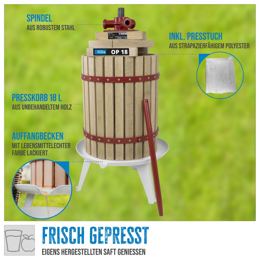 • Ruční lis GÜDE, určený k domácí výrobě moštů nebo ovocných šťáv.
