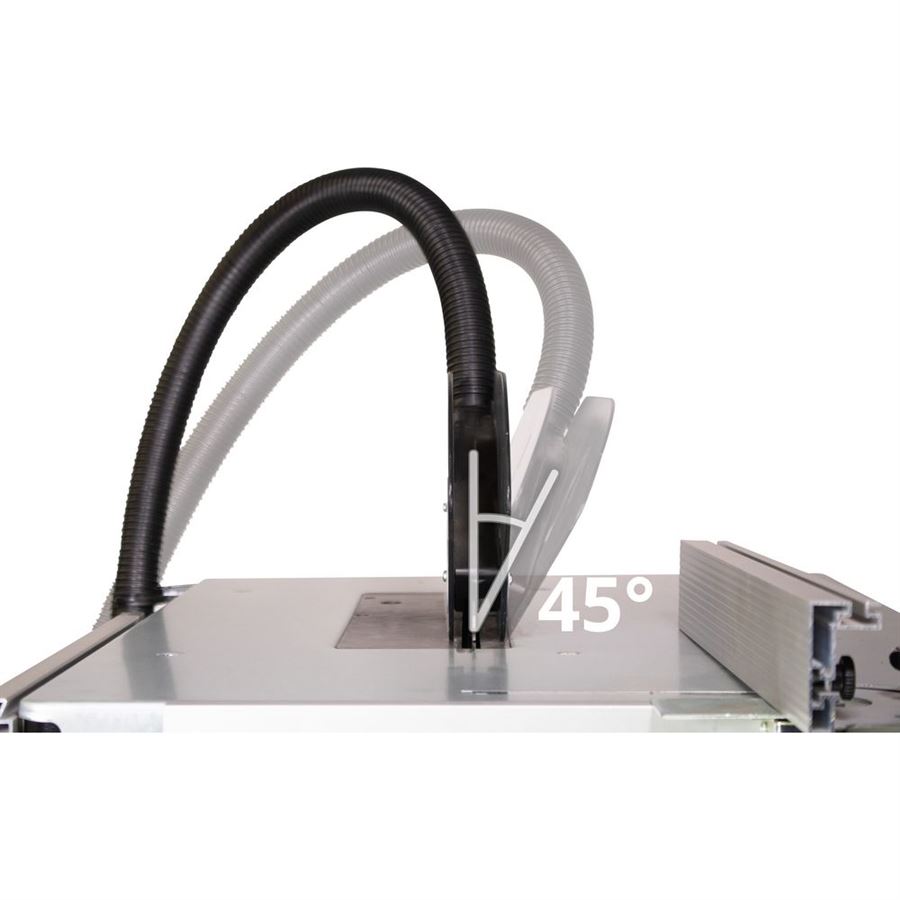 • Konstrukce: stabilní ocelový rám, prodloužený pracovní stůl (-> zadní přídavný nástavec), kryt řezného kotouče s integrovaným zařízením pro odvod pilin, příčný/podélný/úhlový doraz, přípojka odsávání.