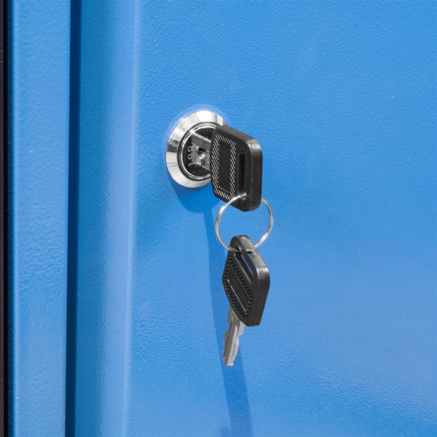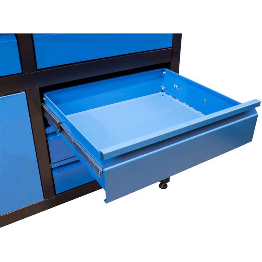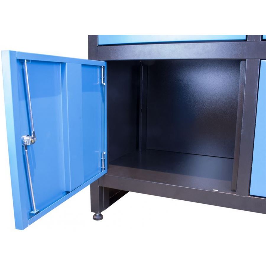 • Vybavení: 6 zásuvek (d x š x v: 440 x 400 x 95 mm; max. nosnost: 25 kg, plně výsuvné - teleskopické vodicí lišty); 2 uzamykatelné dveřové skříňky (d x š x v: 465 x 400 x 390 mm; dvířka s vnitřními výztužemi, cylindrické zámky).