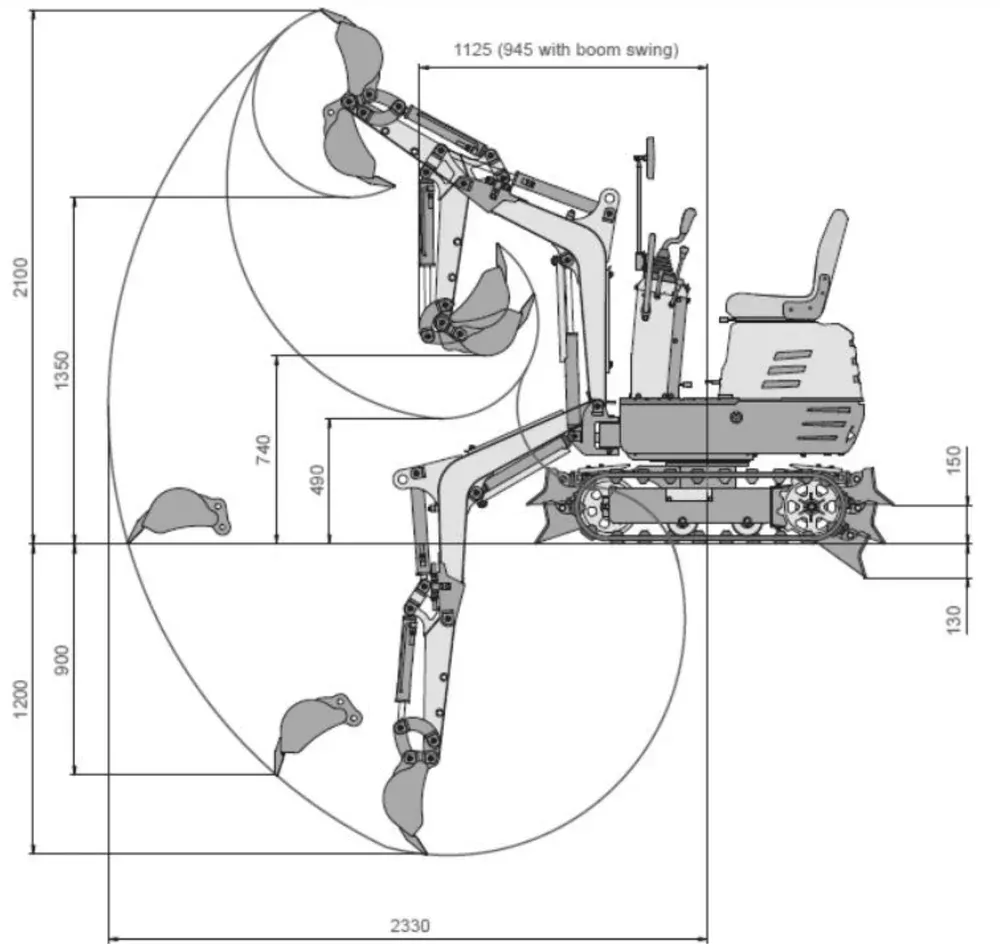 Rameno lze otáček v rozashu až +/-70°, tudíž se hodí pro výkopové práce kolem budov, např. hydroizolační drenáže.