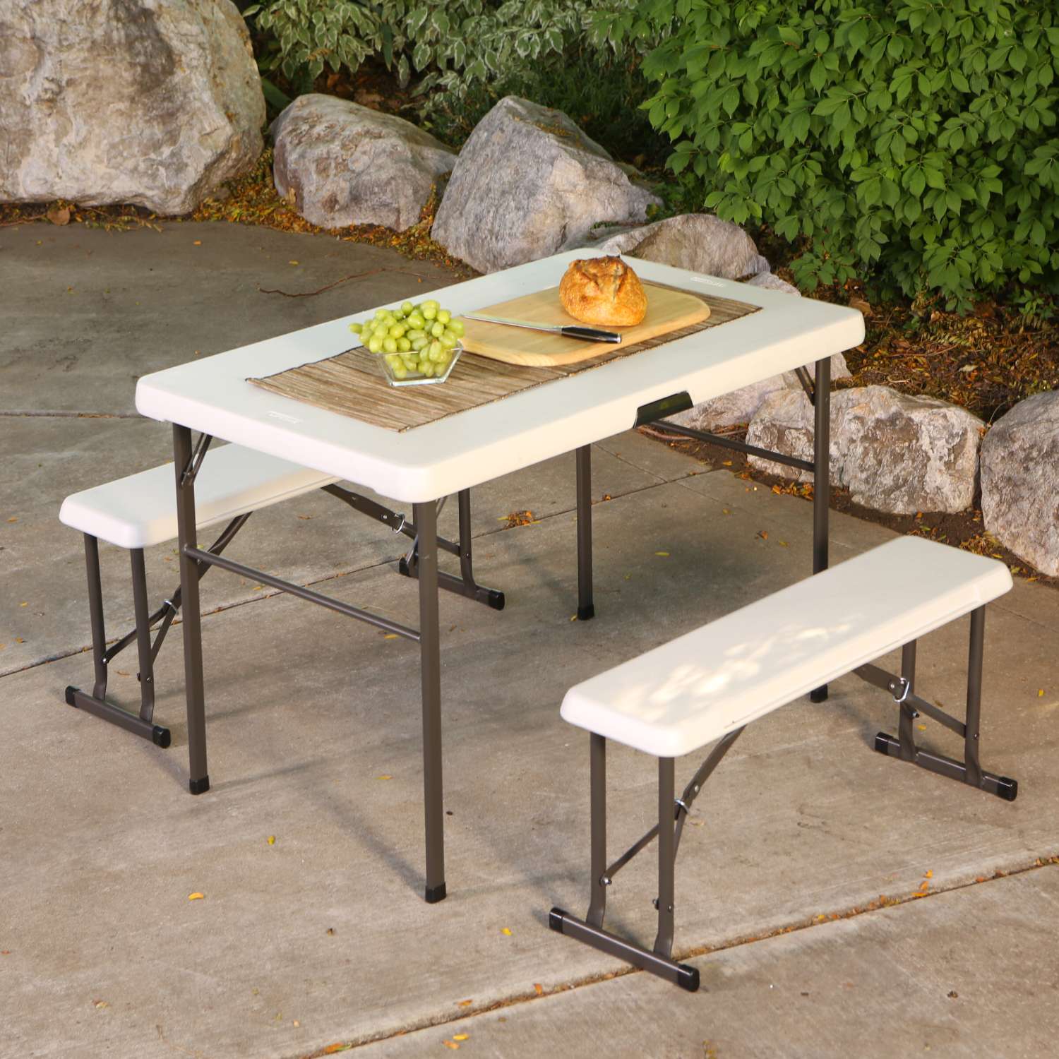 Skládací set campingového stolu a dvou lavic. Kombinace ocelové nosné kostry a vysoce odolného UV stabilizovaného polyetylenu (HDPE). Odolnost vůči vlivu počasí. Plast na slunci nežloutne ani nekřehne. Stůl i židle je možné jednoduše složit a židle připevnit na spodní stranu složeného stolu vše do jednoho setu.