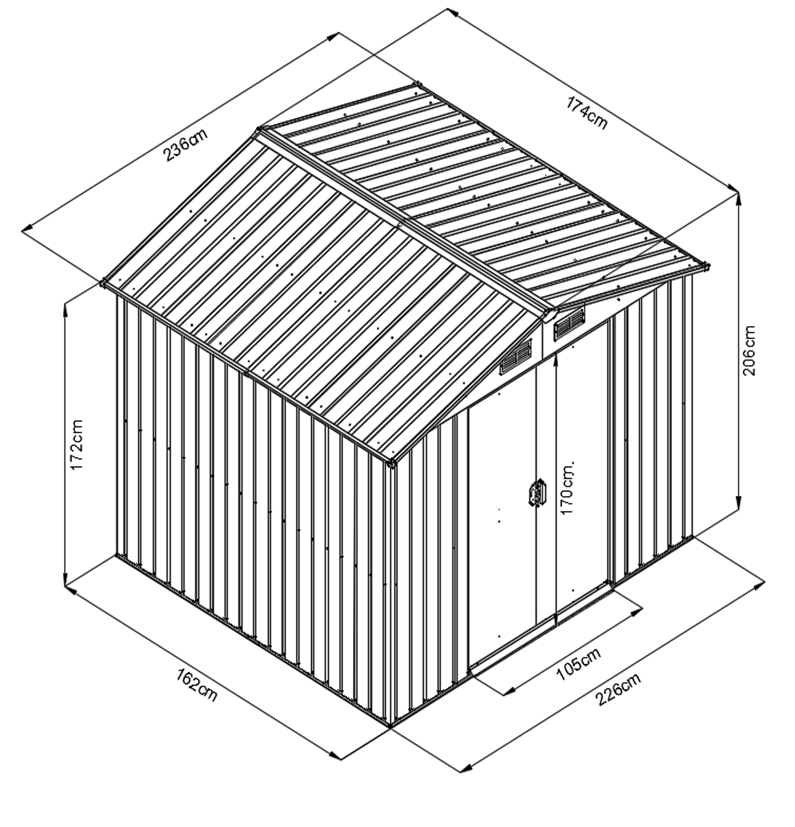 Domek je možné použít k uskladnění zahrádkářských, sportovních, bazénových, grilovacích, campingových, motoristických a dalších potřeb. Jde o jeden z nejkvalitnějších domků na českém trhu se sílou stěny 0,25 mm. Moderní design, barva, snadná montáž, celoroční použití. Kvalitní materiál s povrchovou úpravou - elektrolyticky pozinkovaný plech s žárově nanesenou barvou. Sedlová střecha, čelní posuvné dveře. Možnost uzamčení (zámek není obsahem dodávky).