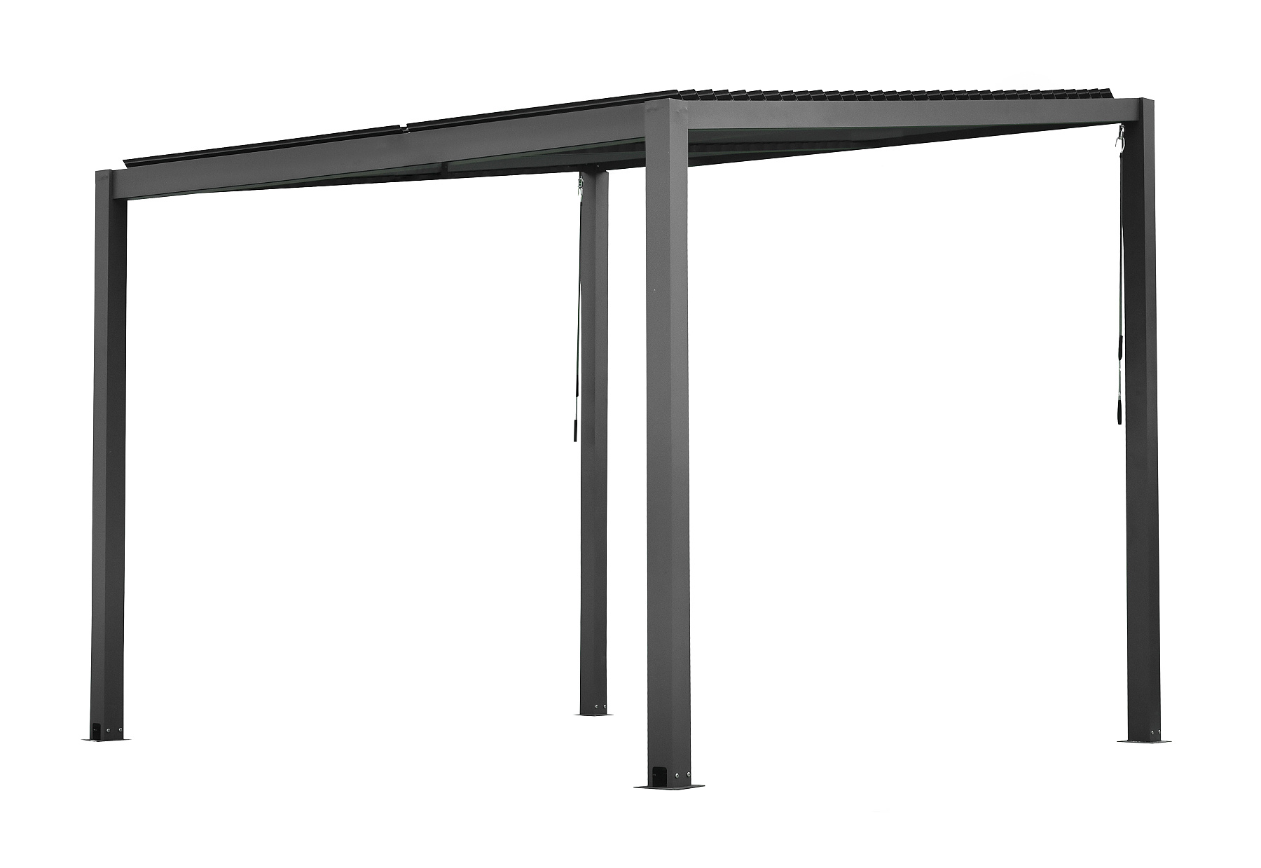 Zahradní hliníková pergola se šikmou střechou a manuálním ovládáním střešních lamel. Zahradní hliníková pergola, ve které naleznete příjemné místo k odpočinku v čím dál tím častějších horkých letních dnech. Střecha je složená z desítek otočných lamel a ochrání Vás před nepříznivým počasím. Lamely je možné manuálně otáčet v úhlu 0 až 90o. Malá ručně ovládaná klika ovládá mechanismus střechy a otáčením kliky zajistíte synchronizované natáčení lamel. Úhel natočení 90o zajistí otevřenou střechu a úhel 0o zcela uzavřenou střechu. Konstrukce pergoly je vyrobená z odolné hliníkové slitiny a je nastříkaná práškovou vypalovanou barvou (komaxit), a proto odolává přírodním klimatickým vlivům.