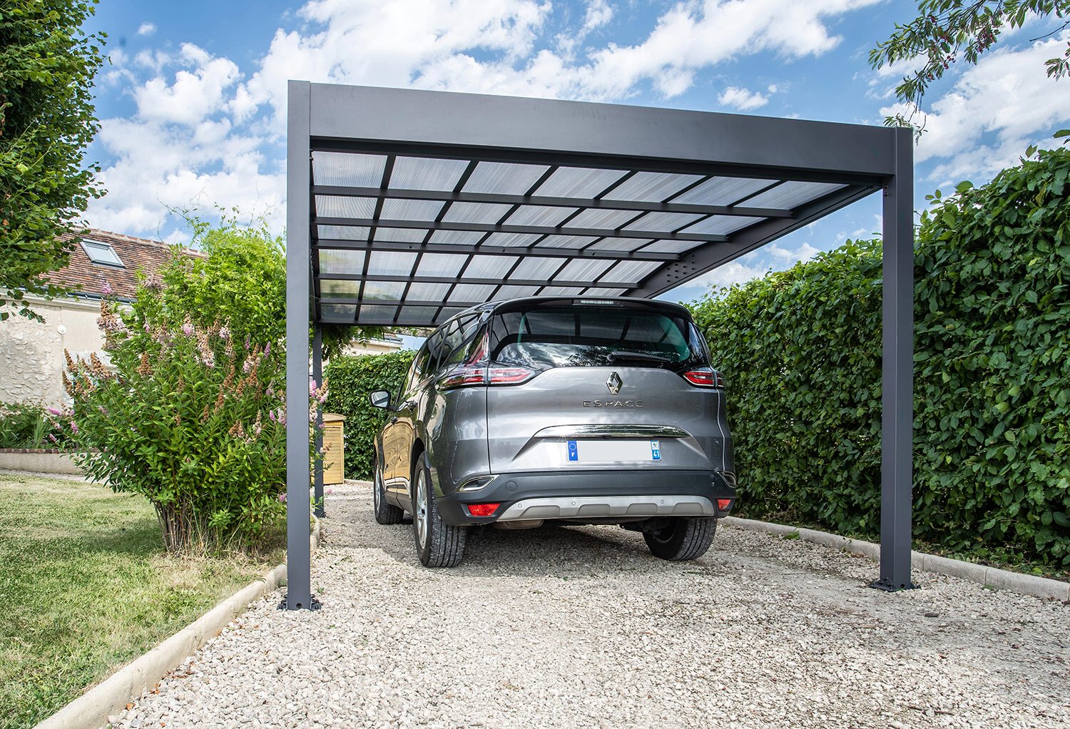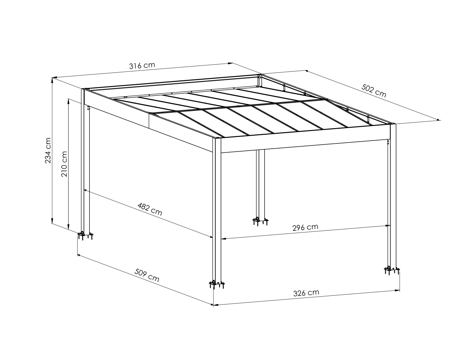 Celohliníkový přístřešek skvěle poslouží jako garážové stání pro Váš automobil. Přístřešek můžete využít i na uskladnění zahradního traktůrku nebo zahradní mechanizace, popřípadě poslouží i jako přístřešek pro zahradní posezení. Robustní a odolná konstrukce je z obdélníkových hliníkových profilů 100 x 100 mm opatřených vypalovanou práškovou barvou odstín antracit. Střecha je vyrobena z komůrkového polykarbonátu síly 6 mm kouřově hnědé (bronz) barvy. Montáž přístřešku je nutno provádět na rovném zpevněném podkladu (nejlépe beton, dlaždice, apod.).