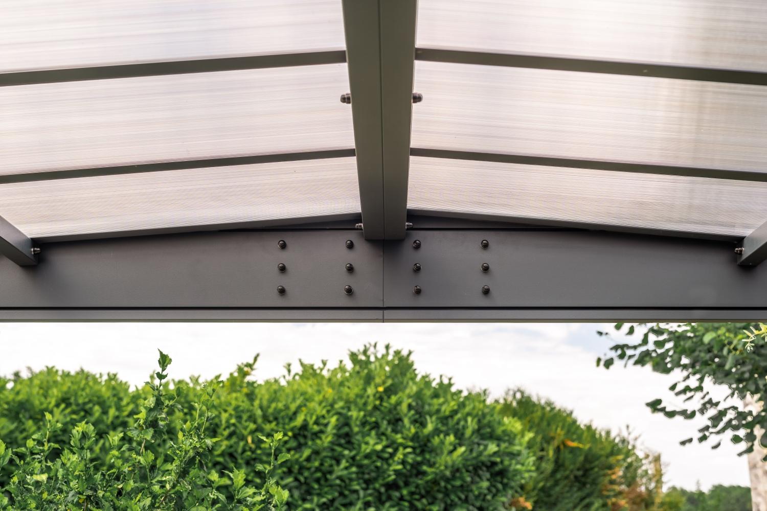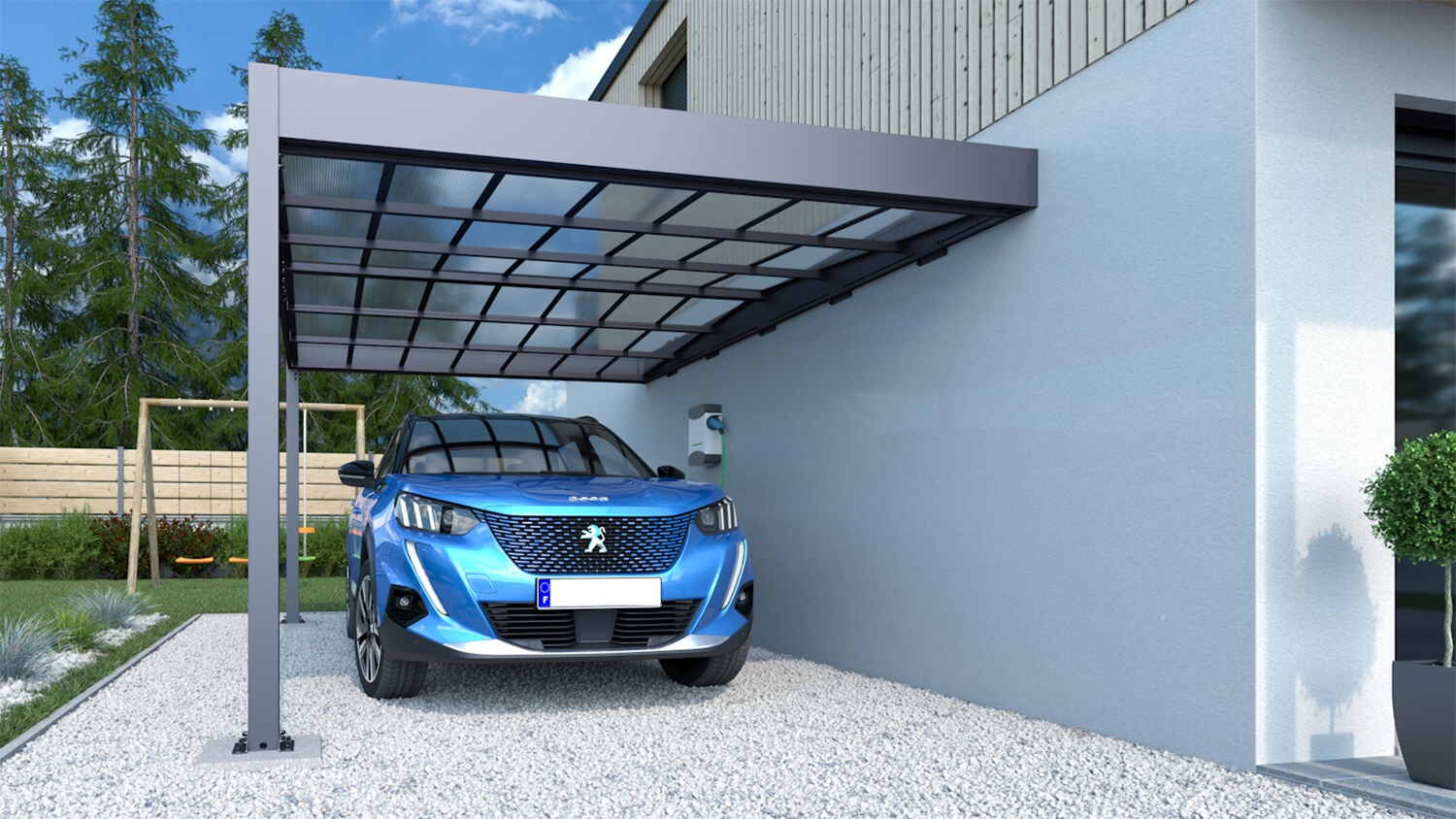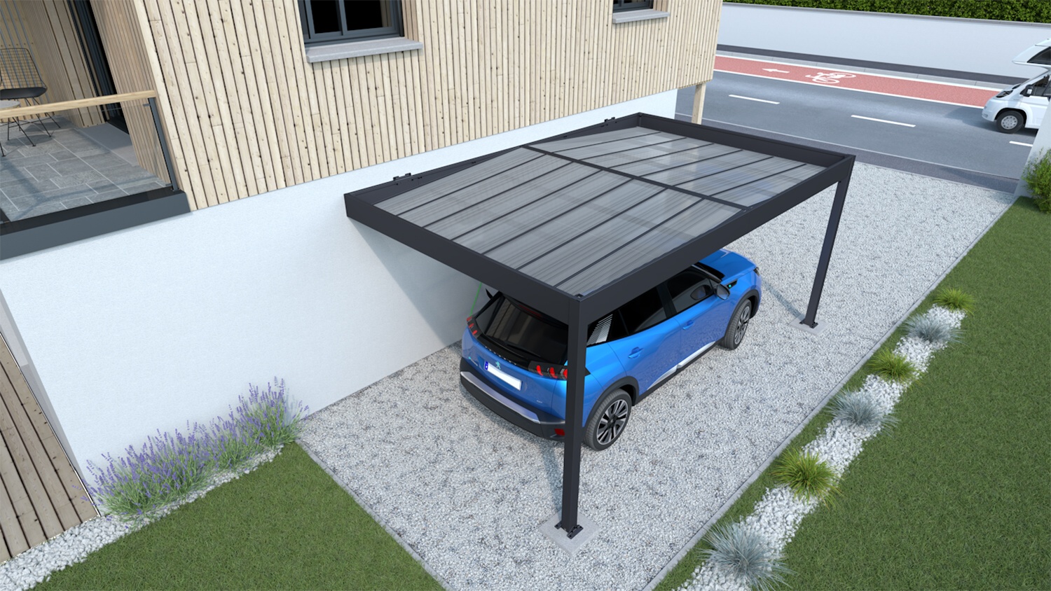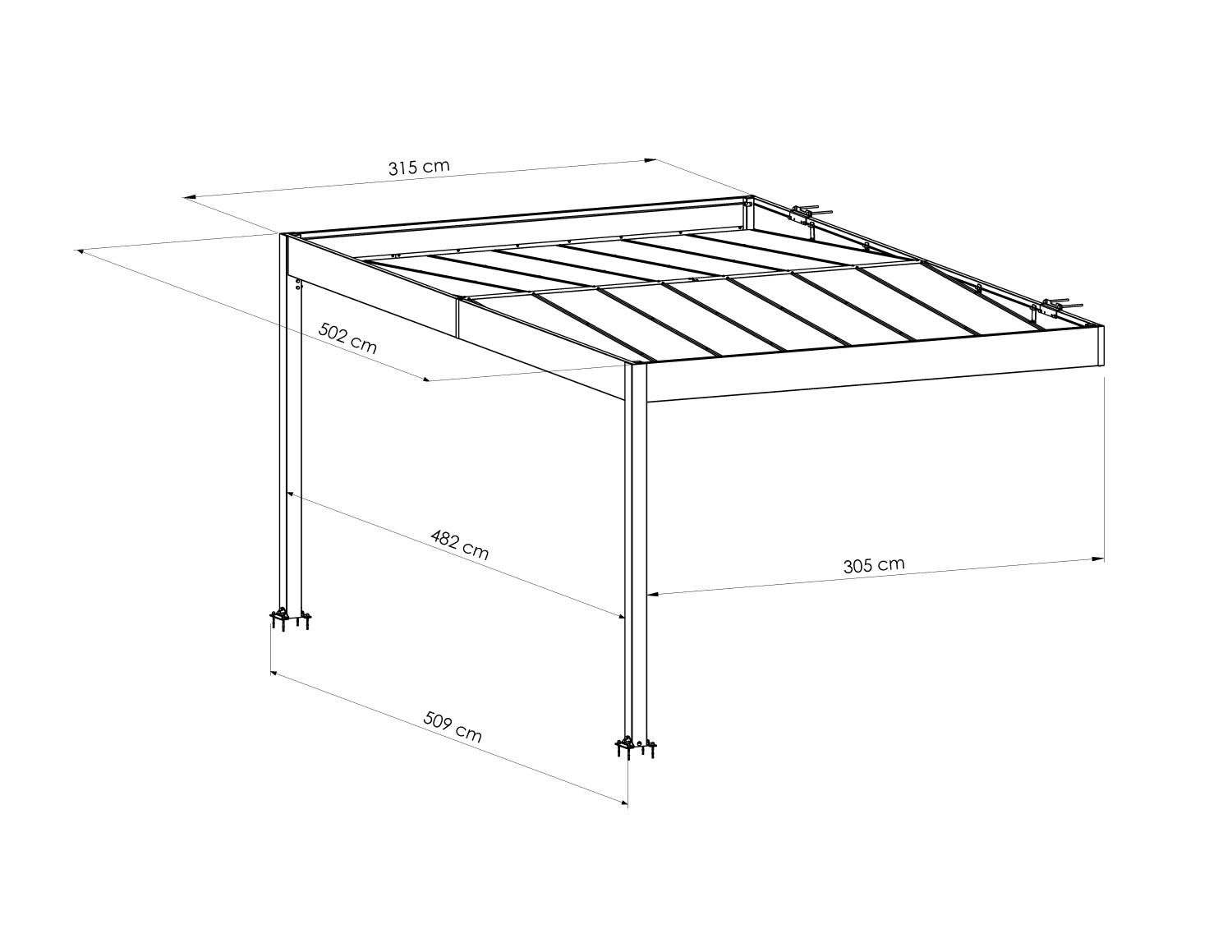Celohliníkový přístřešek ke zdi skvěle poslouží jako garážové stání pro Váš automobil. Přístřešek můžete využít i na uskladnění zahradního traktůrku nebo zahradní mechanizace, popřípadě poslouží i jako přístřešek pro zahradní posezení. Robustní a odolná konstrukce je z obdélníkových hliníkových profilů 100 x 100 mm opatřených vypalovanou práškovou barvou odstín antracit. Střecha je vyrobena z komůrkového polykarbonátu síly 6 mm kouřově hnědé (bronz) barvy. Montáž přístřešku je nutno provádět na rovném zpevněném podkladu (nejlépe beton, dlaždice, apod.).