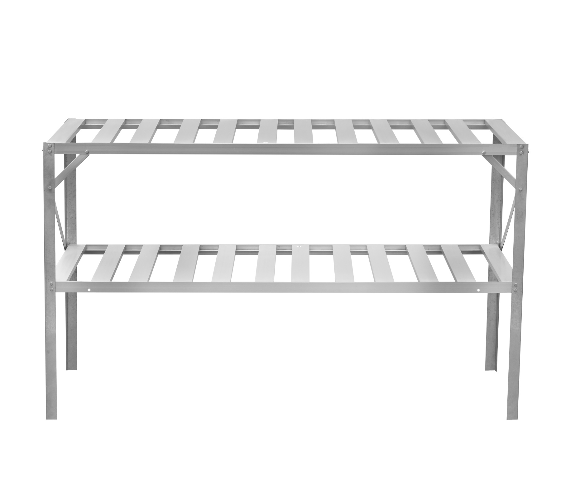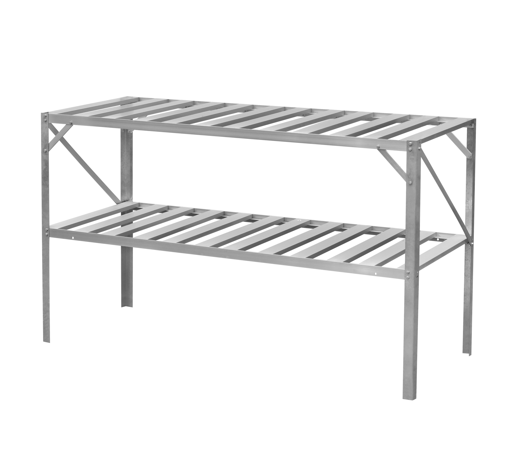 Celohliníkový dvoupolicový regál stojící na zemi. Rozměry regálu jsou d 130 x š 50 x v 74 cm. Vhodné pro skleníky všech typů. Univerzální produkt. Dodáváme v rozebraném stavu jako stavebnici.