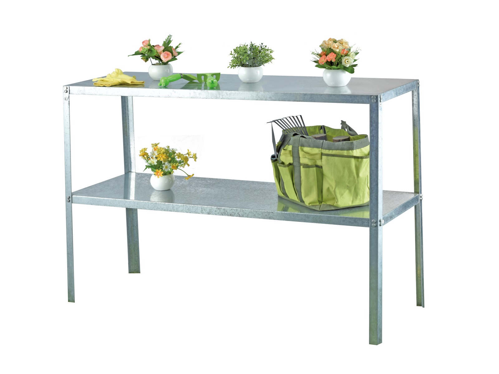 Ocelý dvoupolicový regál z pozinkovaného plechu stojící na zemi. Rozměry regálu jsou d 115 x š 40 x v 80 cm. Vhodné pro skleníky všech typů. Univerzální produkt. Dodáváme v rozebraném stavu jako stavebnici.
