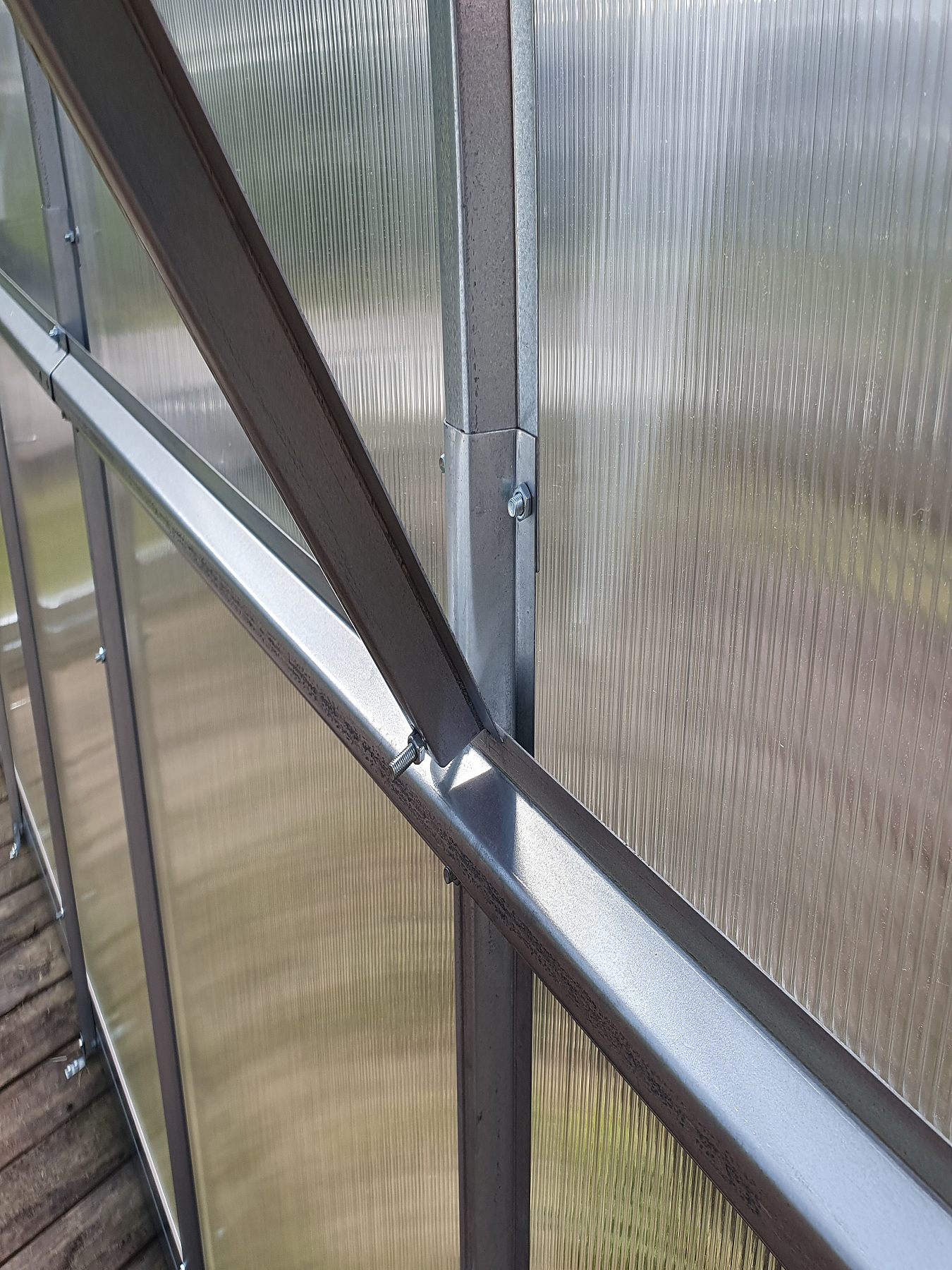 Konstrukce skleníku je sešroubovaná z žárově pozinkovaných ocelových omega profilů šířky 56 mm a síly 1 mm. Profily jsou žárově pozinkované = ocel se po příslušné předběžné úpravě ponoří do zinkové lázně o teplotě cca 450°C, zinek a ocel přitom spolu reagují a na povrchu oceli se vytvoří slitina železa a zinku. Toto nezničitelné spojení zinku a oceli vytvoří extrémně silnou odolnost vůči korozi. Jednotlivá žebra nosných oblouků jsou od sebe vzdálena osově 67 cm. Přední čelo má dvoudílné dveře na pantech, zadní čelo obsahuje větrací okénko. Skleník není průchozí. Jako příplatkové příslušenství lze dokoupit střešní ventilační okno, automatický otvírač okna, různé druhy regálů, teploměry, vlhkoměry apod.