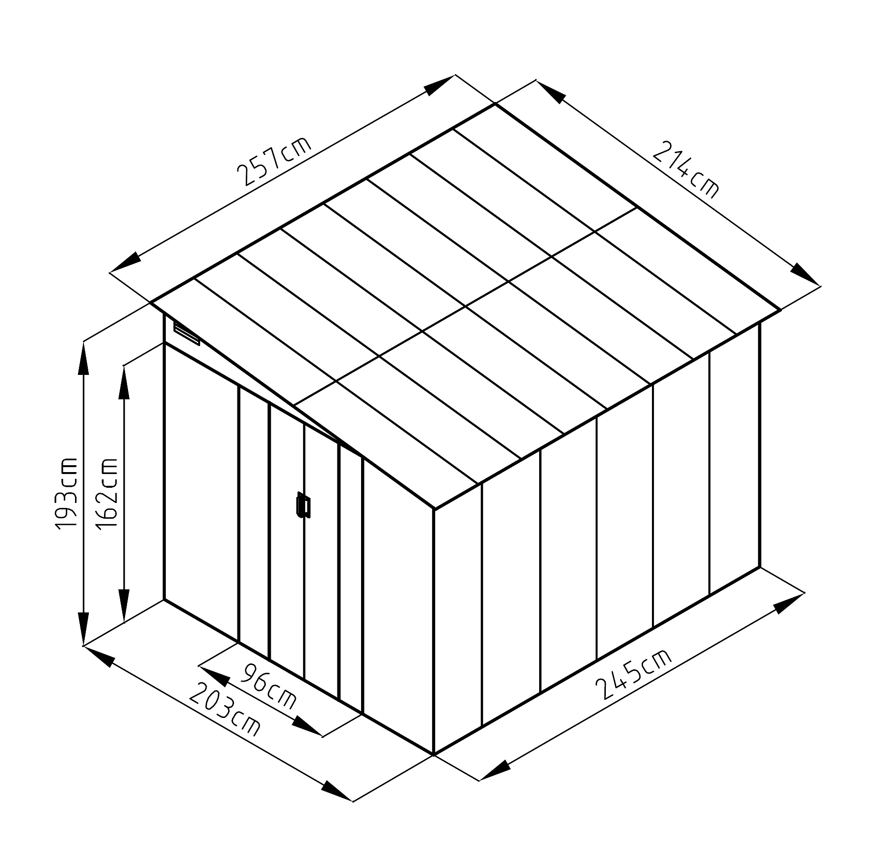 Klasická pultová střecha poskytuje dostatek prostoru a umožňuje efektivní odvod dešťové vody. Čelní vnitřní posuvné dvoukřídlé dveře o rozměru 96 x 162 cm dávají snadný přístup do domku, čímž zvyšují jeho praktičnost a pohodlí užívání. WANDHAUS 78 je tedy kompletním řešením pro účinné a bezpečné uskladnění vašich věcí na zahradě či venkovním prostoru.