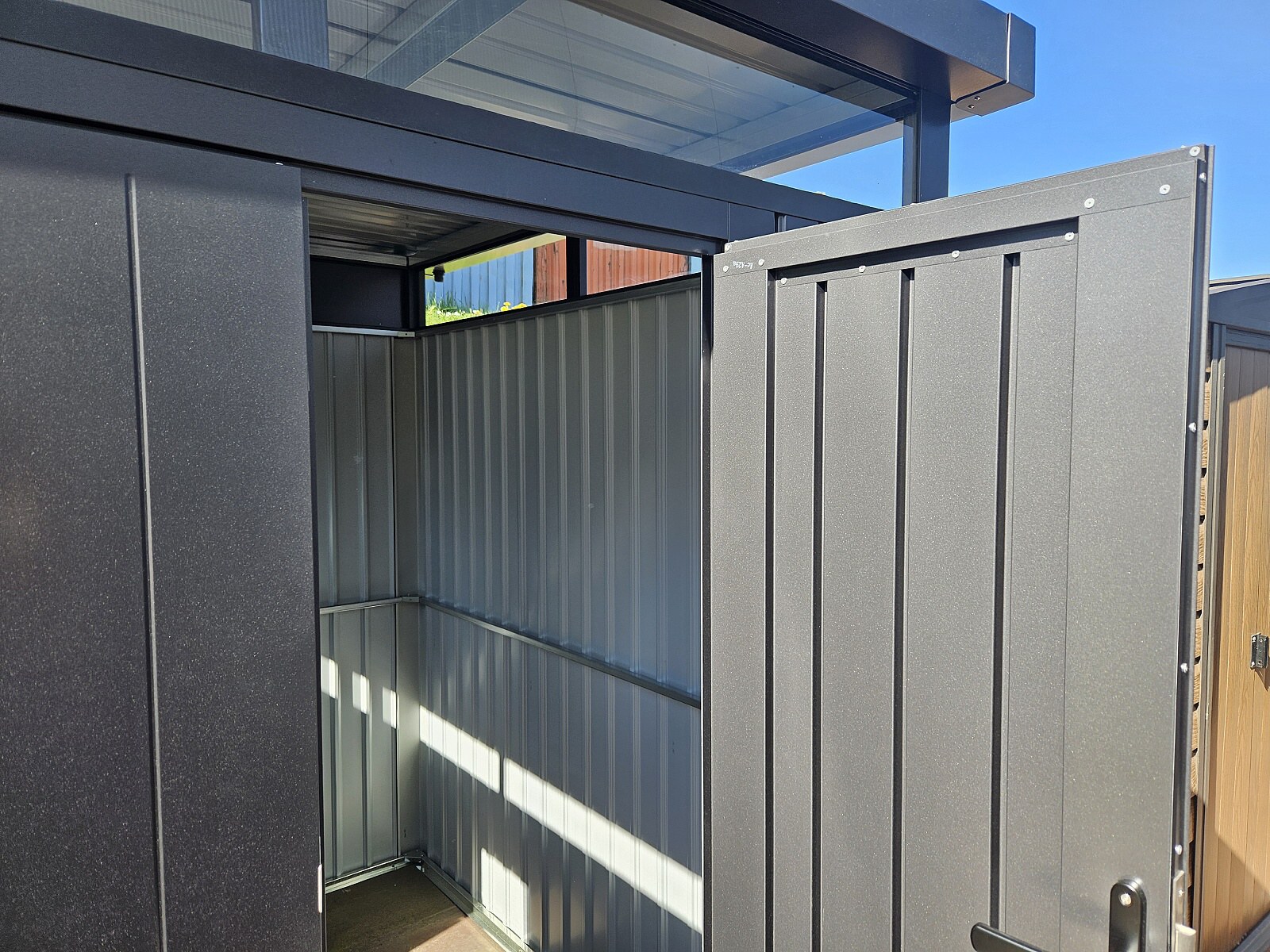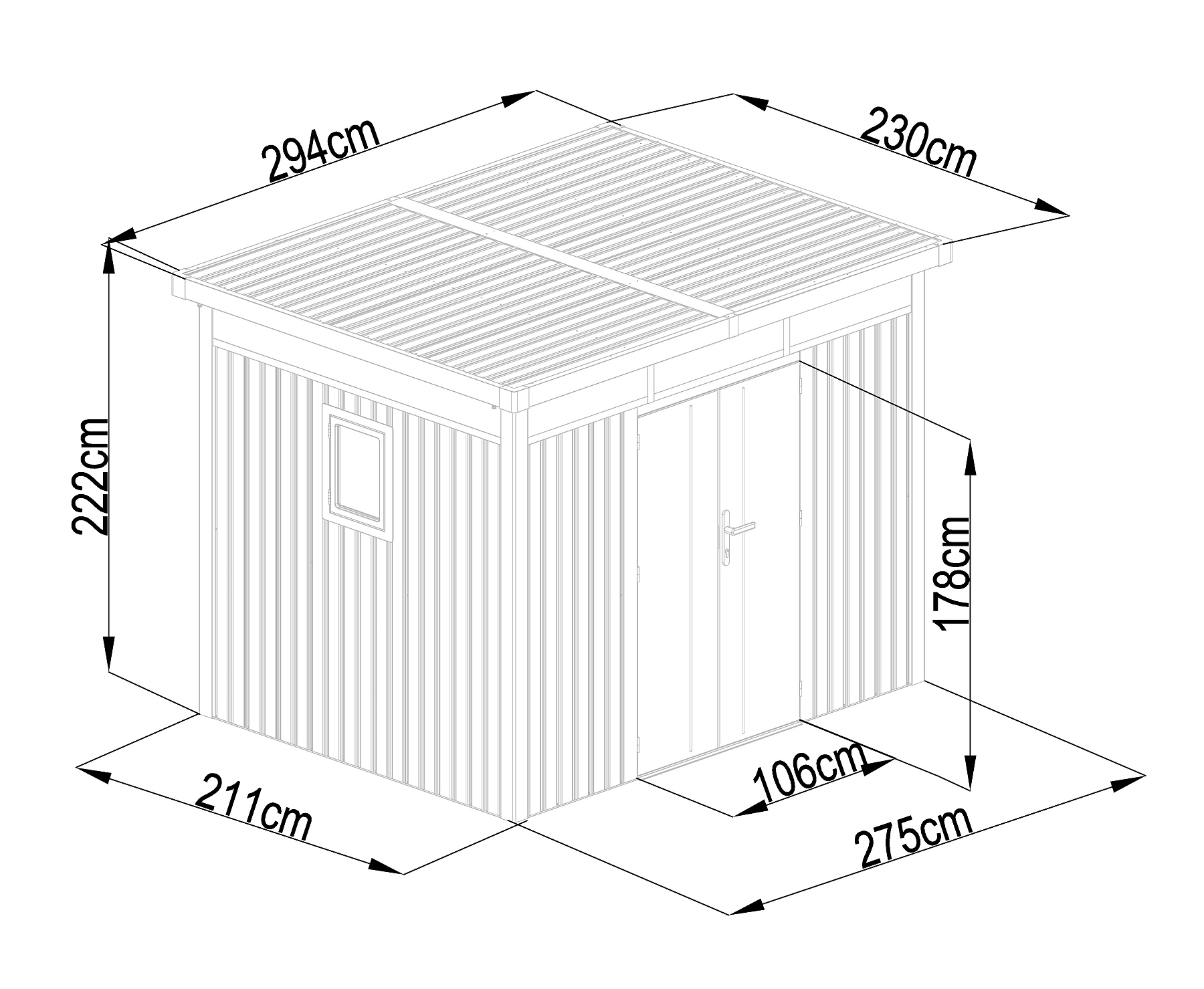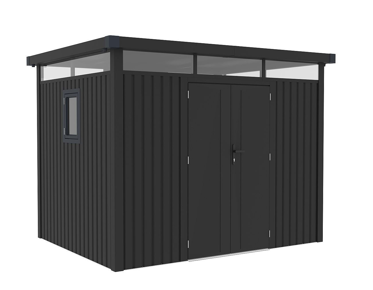 Tato praktická konstrukce váží 199 kg a má antracitovou barvu, která se snadno začlení do každého venkovního prostředí. Plochá střecha a dvojité křídlové dveře o rozměrech š 106 x v 178 cm dodávají domku jednoduchý a moderní vzhled.