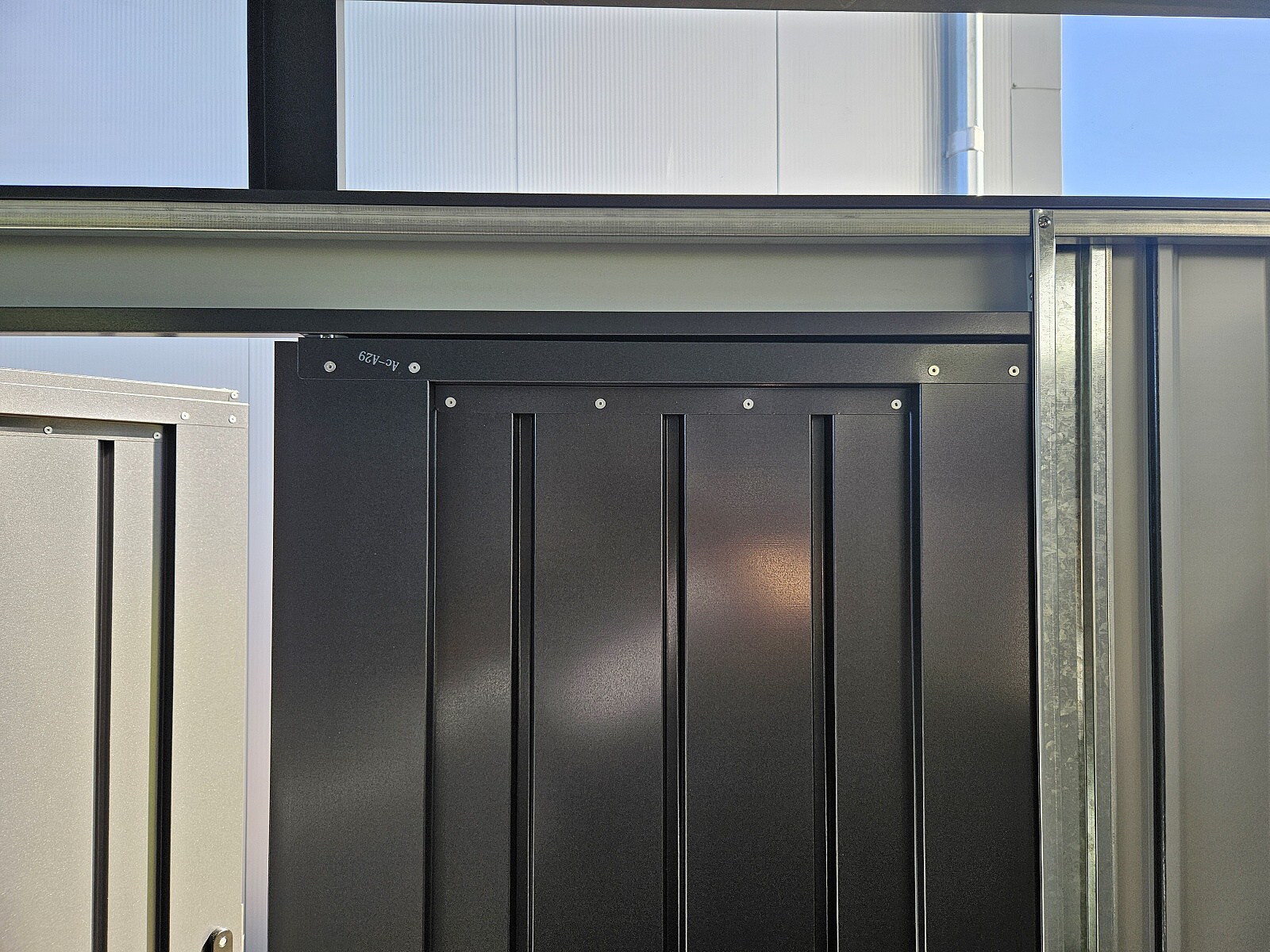 Dvojité křídlové dveře, které lze bezpečně uzamknout, zajišťují pohodlný přístup dovnitř, kde najdete dostatek prostoru pro úschovu jízdních kol, zahradního nářadí, květináčů, nebo příslušenství k bazénu. Prosvětlené vrchní části panelů a otevíratelné okno dodávají domku svěžest a vzdušnost.