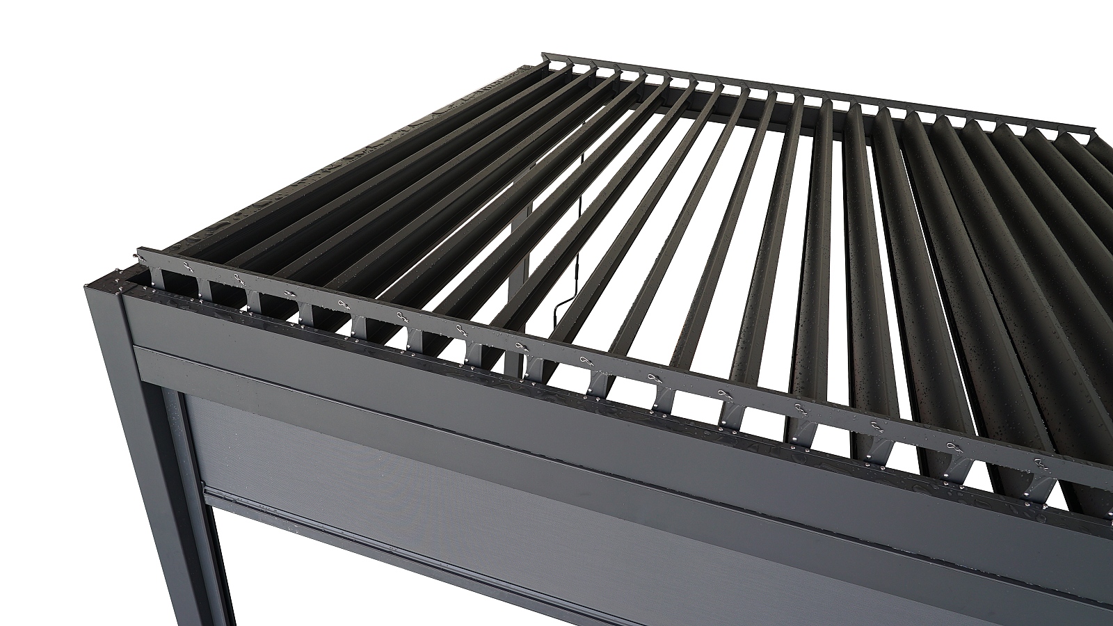 Pergolu lze vybavit stahovatelnými síťovými bočními roletami (příplatkové příslušenství), které poskytnou dodatečné zastínění a soukromí. Rolety lze snadno povytáhnout a zafixovat podle aktuálních potřeb. To vám umožňuje vytvořit si útulné prostředí i při větším slunečním žáru nebo v chladnějším počasí.