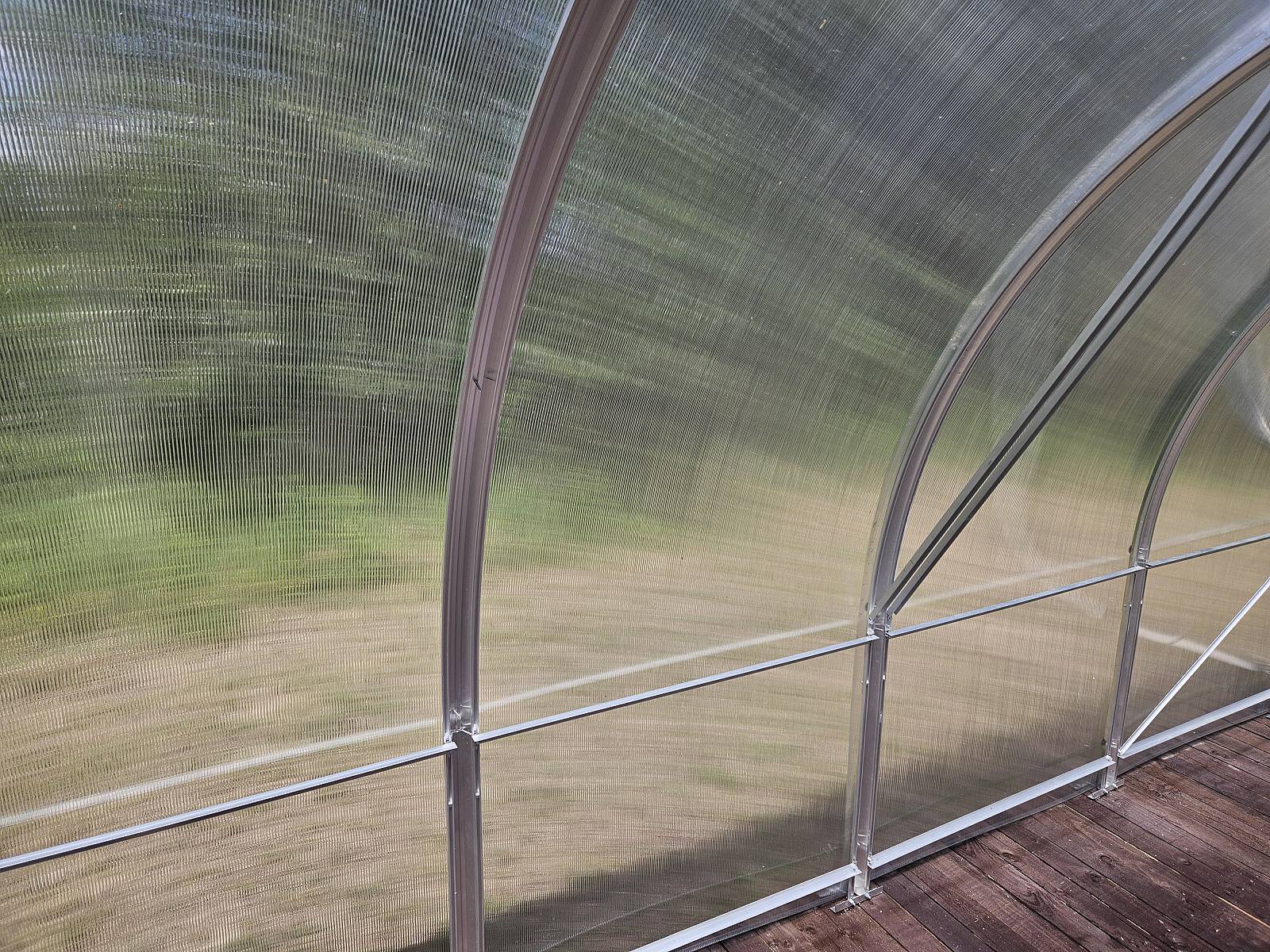 Konstrukce skleníku je sešroubována ze silných hliníkových profilů (masivní 1 mm silný a 65 mm široký eloxovaný hliníkový profil) a doplněna prémiovým komůrkovým polykarbonátem s UV filtrem od britské firmy BRETT MARTIN s prodlouženou smluvní zárukou 10 let na nerozbitnost polykarbonátu krupobitím. Tato kombinace dělá ze skleníků řady VITAVIA BOHEMY jeden nejkvalitnějších a současně na montáž nejjednodušších skleníků na českém trhu. Jednotlivé profily se vzájemně sešroubují a po jejich sestavení vznikne velmi stabilní oblouková konstrukce bez nutnosti stavby skleníkové podezdívky. Skleník je vybaven kotvami přímo do země. Montáž skleníku zvládnete svépomocí ve dvou až třech osobách. V půdě se zahradní skleník upevňuje zakopáváním patek konstrukce do země, případně jejich zalitím do betonu (doporučujeme).