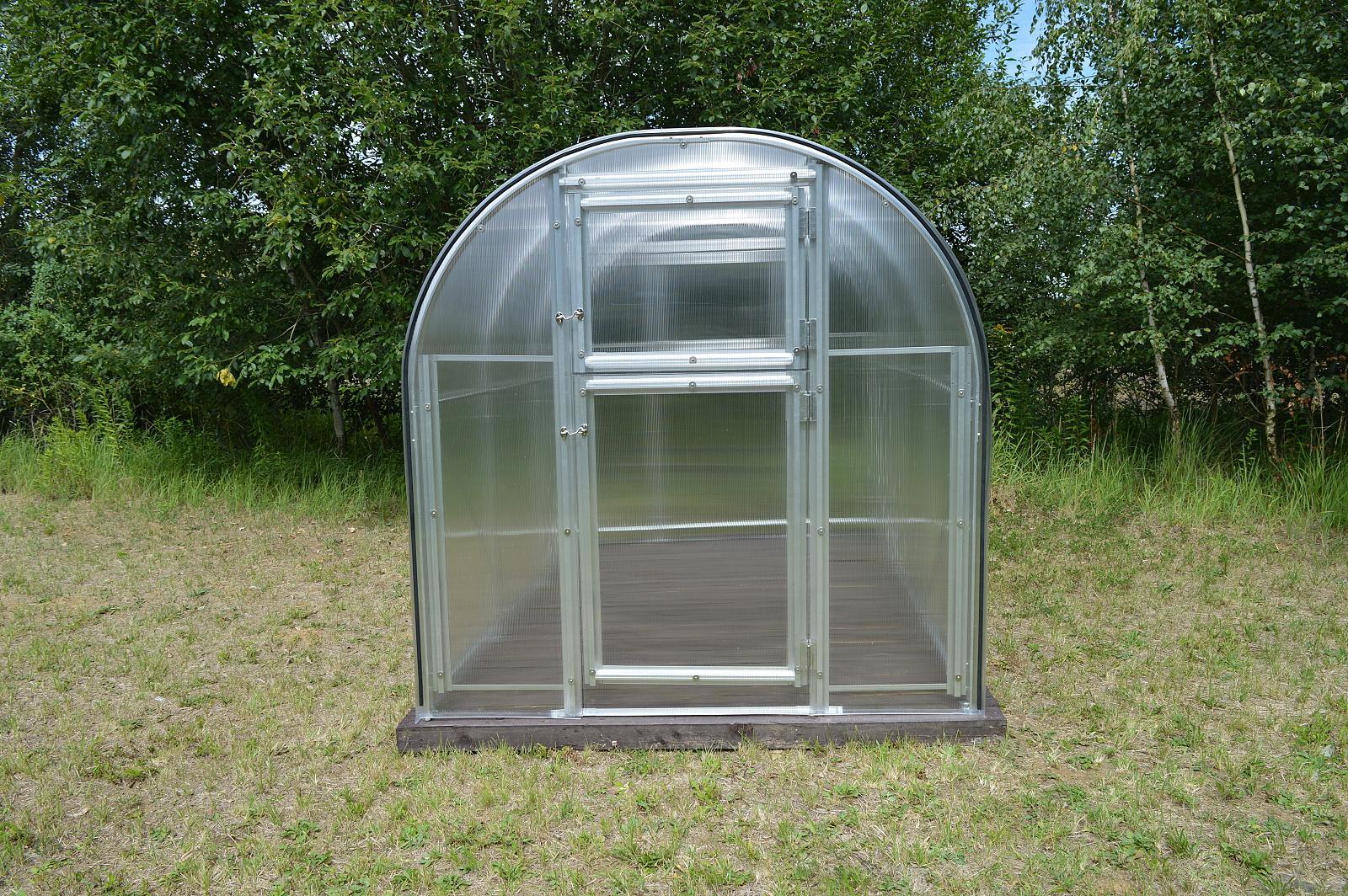 šířka 2,9 m, cca délky 4 / 6 / 8 m, masivní 1 mm silný a 65 mm široký eloxovaný hliníkový profil, rozteč oblouků 100 cm, vnitřní podpěry obloukové konstrukce, dvojité dveře vpředu, ventilační okno vzadu, prosklení nutno vyřezat z dodaných polykarbonátových desek |