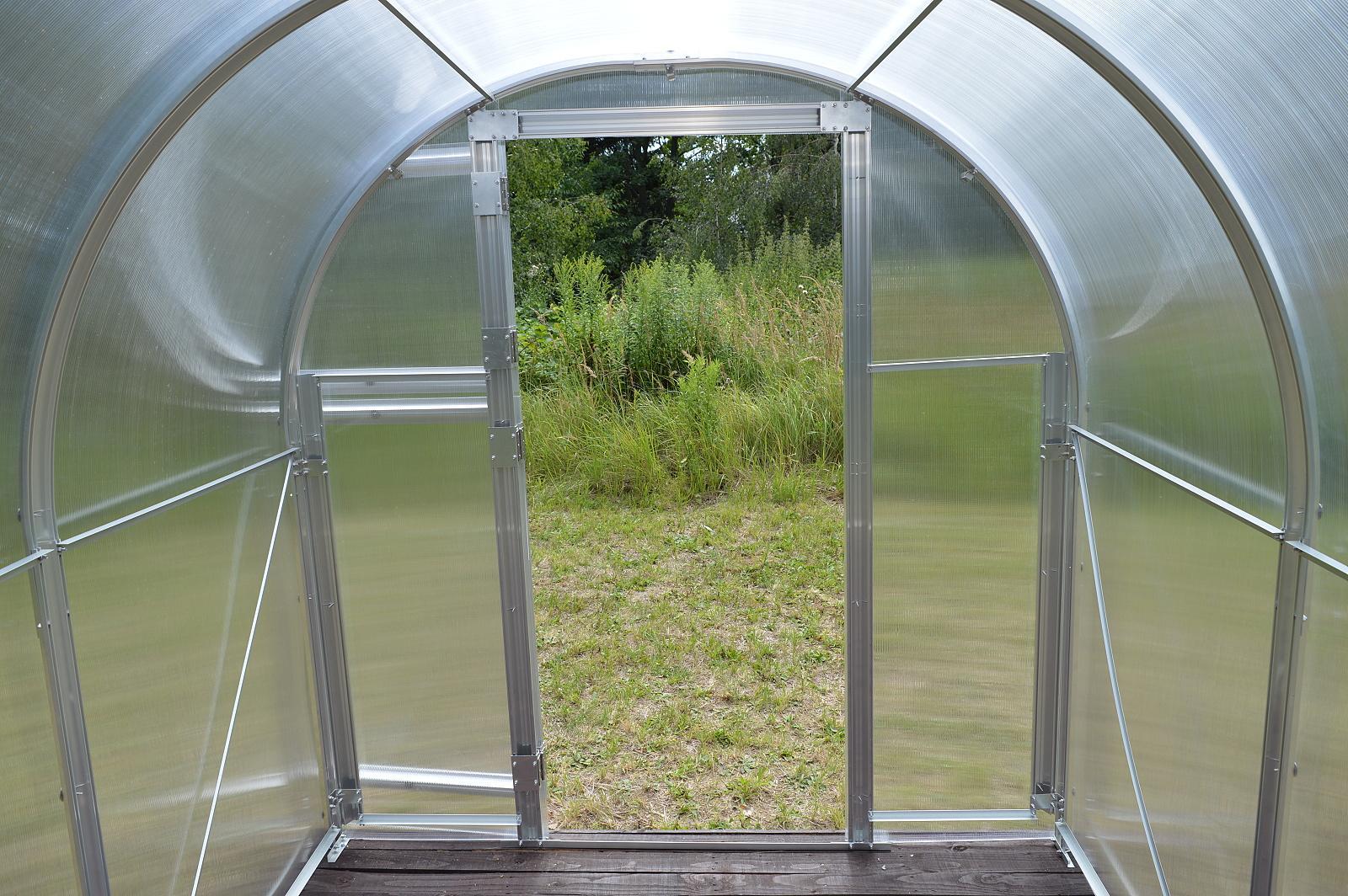 šířka 2,9 m, cca délky 4 / 6 / 8 m, masivní 1 mm silný a 65 mm široký eloxovaný hliníkový profil, rozteč oblouků 100 cm, vnitřní podpěry obloukové konstrukce, dvojité dveře vpředu, ventilační okno vzadu, prosklení nutno vyřezat z dodaných polykarbonátových desek |