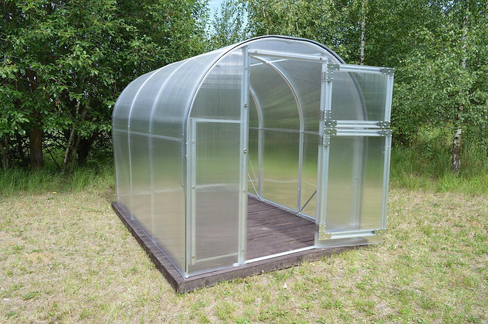 šířka 2,9 m, cca délky 4 / 6 / 8 m, masivní 1 mm silný a 65 mm široký eloxovaný hliníkový profil, rozteč oblouků 100 cm, vnitřní podpěry obloukové konstrukce, dvojité dveře vpředu, ventilační okno vzadu, prosklení nutno vyřezat z dodaných polykarbonátových desek |