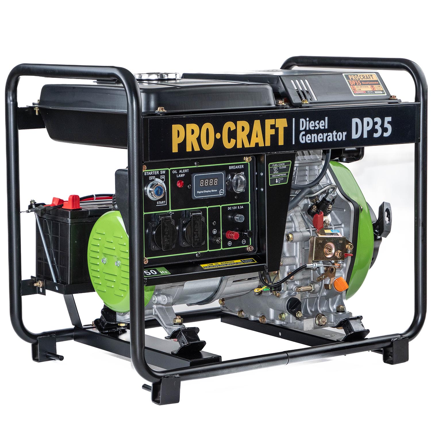 Dieselová elektrocentrála Procraft DP35 je určena k použití jako nezávislý generátor elektrického proudu při výpadcích elektřiny, jako zdroj energie při stavebnictví, v domácnosti, kde není elektrická síť dostupná. Výhodou je nižší spotřeba paliva a dlouhodobější použití než u benzinových elektrocentrál. Díky vysokému výkonu umožňuje napájení nejen domácích spotřebičů, ale i spotřebičů indukčního typu. Elektrocentrála má palivovou nádrž o objemu 12,5 l, čím zaručí dlouhý nepřetržitý provoz. Elektronický start zajišťuje rychlé spuštění benzinového motoru. Robustní ochranný rám umožňuje použití elektrocentrály v jakýkoliv podmínkách a taky usnadňuje transportování. Součástí dodávky je elektrická zástrčka, klíč na svíčku. Balení karton.