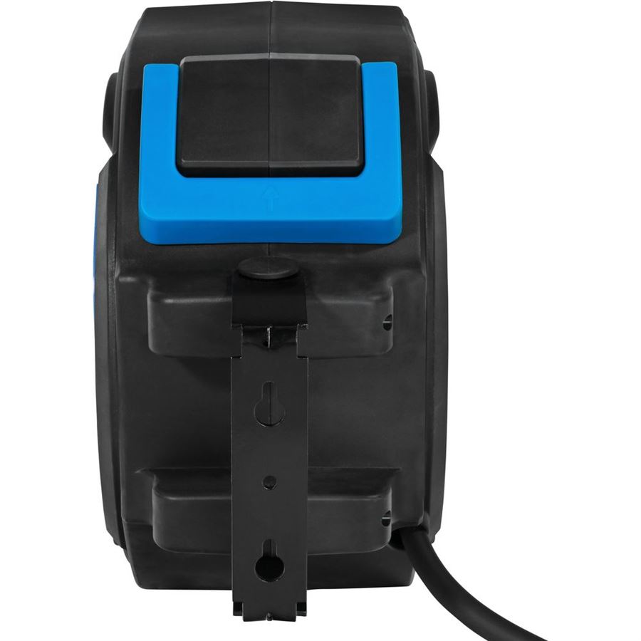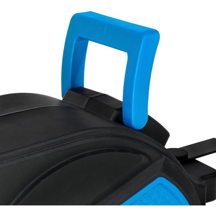 • Nárazuvzdorné plastové pouzdro s praktickou rukojetí je otočné až o 180° na obě strany a s 15 metrů dlouhou a inovativní speciální hadicí se směsí pryže a PVC snadno dosáhnete na jakoukoli pracovní plochu v tomto okruhu.