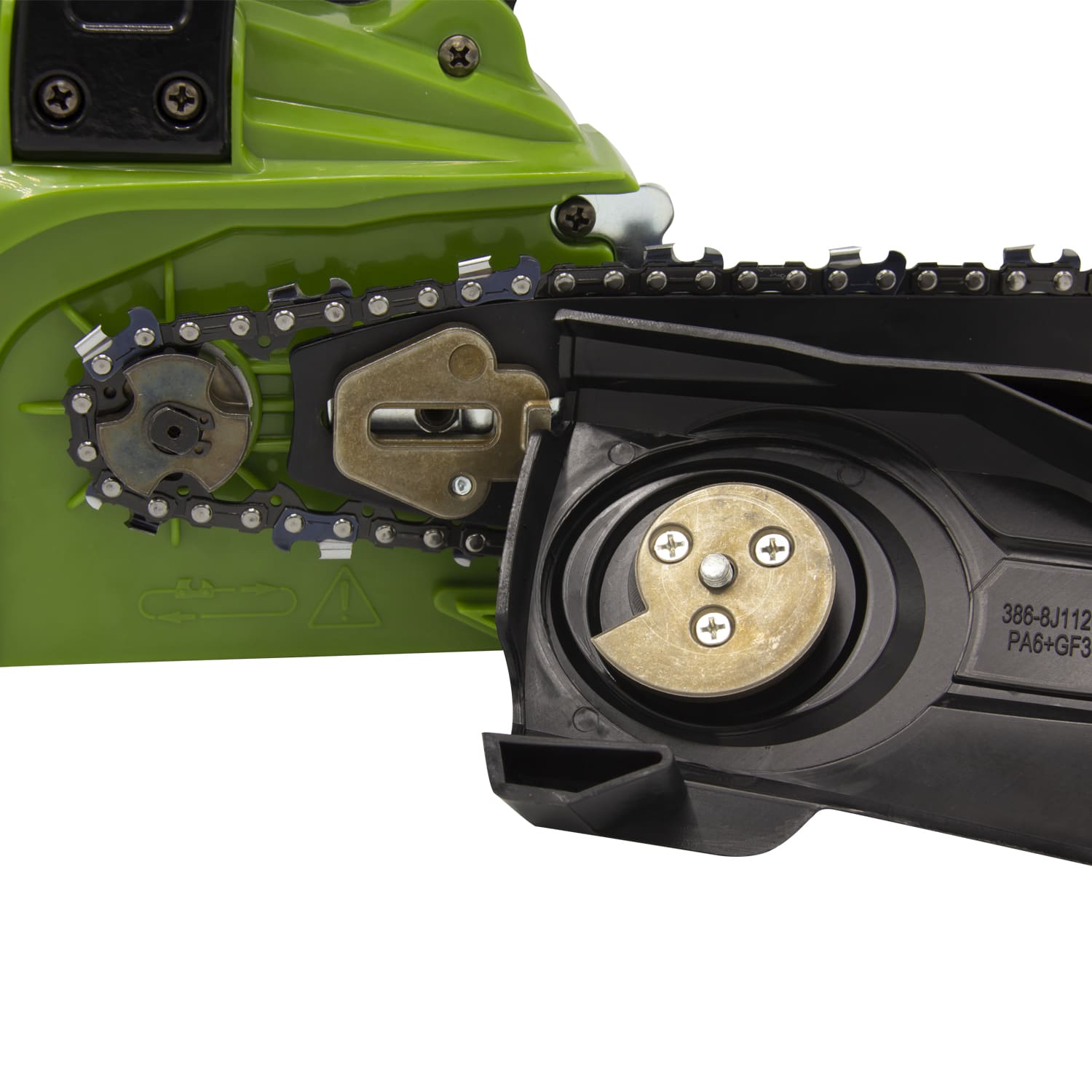 AKU jednoruční řetězová pila je díky svým kompaktním rozměrům užitečným pomocníkem při prořezávání stromů a keřů při práci v omezeném prostoru. Její provoz je v porovnání s většími stroji tichý a díky bezuhlíkovému motoru (Brushless) dostatečně výkonná. Je vybavena bezpečnostním krytem pilového řetězu. Stroj je dodávaný včetně vodící lišty a pilového řetězu v kartonu s montážním klíčem a nádobou na mazací olej - bez akumulátoru a nabíječky.