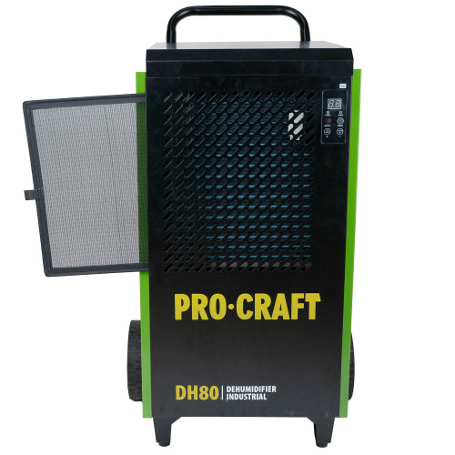 Profesionální vysoušeč vzduchu Procraft DH80 je určen k vysoušení vzduchu obytných prostor i komerčních objektů s podlahovou plochou do 180 m2. Disponuje výkonem až 70 l/den a průtokem vzduchu až 400 m3/h. Časovač umožnuje nastavit délky chodu vysoušeče. Praktická rukojeť a dvě velká pojezdová kola zaručují snadnou přepravu. Plášť z ocelového plechu a odolná konstrukce umožňuje použití i v náročných průmyslových podmínkách. Zařízení se automaticky vypne, Pokud se nádrž na vodu naplní. Průmyslový odvlhčovač má možnost výměny prachového filtru. Při maximálním naplnění sběrné nádoby se odvlhčovač automaticky vypne a rozsvítí světelná indikace. Velkou výhodou je i možnost nepřetržitého odvlhčování pomocí odtokové hadice, která je součástí balení. Balení karton.