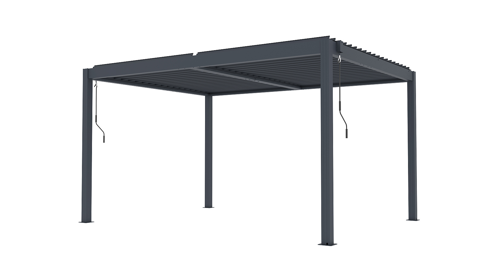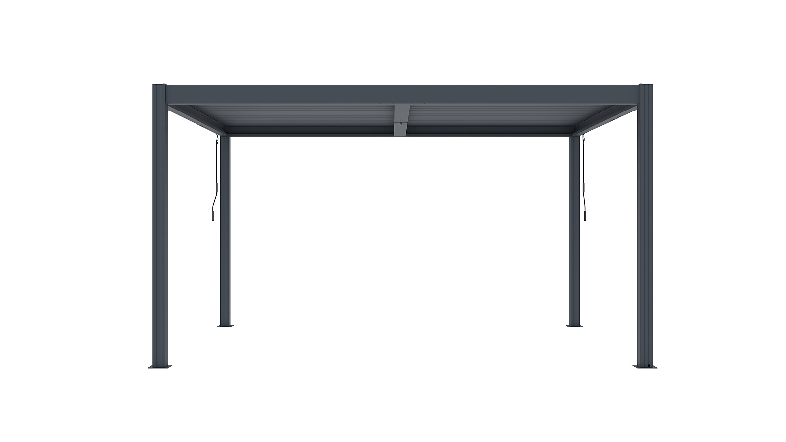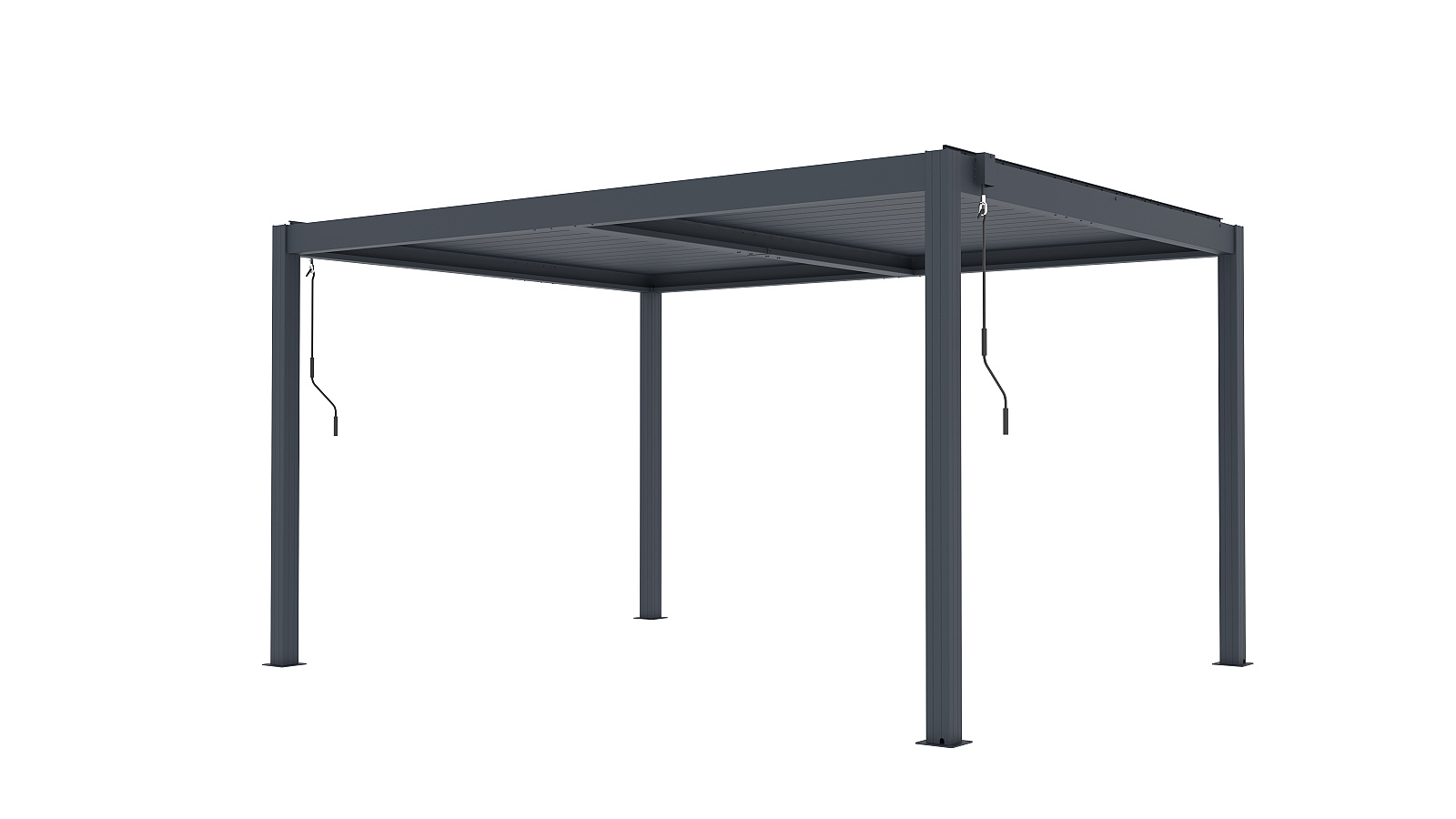 Základní verze bioklimatické pergoly LANITPLAST BIOCLIMATIC BASIC s vodorovnou lamelovou střechou a manuálním ovládáním střešních lamel. Jedná se o základní verzi pergoly, která má konstrukci z hliníku a střechu složenou z desítek otočných ocelových lamel. Lamely je možné manuálně klikou otáčet v úhlu 0 až 110o. Malá ruční klika ovládá mechanismus střechy, přičemž jejím otáčením umožňujete plynulé a synchronizované nastavení lamel. Každou stranu pergoly lze ovládat samostatně, což umožňuje individuální nastavení střešních lamel dle potřeby v závislosti na úhlu dopadajícího slunečního světla. Úhel natočení 90o zajistí otevřenou střechu a úhel 0o uzavřenou střechu. Konstrukce pergoly je vyrobená z odolné hliníkové slitiny a je nastříkaná práškovou vypalovanou barvou komaxit odstín antracit, a proto perfektně odolává přírodním klimatickým vlivům. Střešní lamely jsou vyrobené z ocelového profilu ošetřeného vypalovanou barvou komaxit ve stejném odstínu antracit.