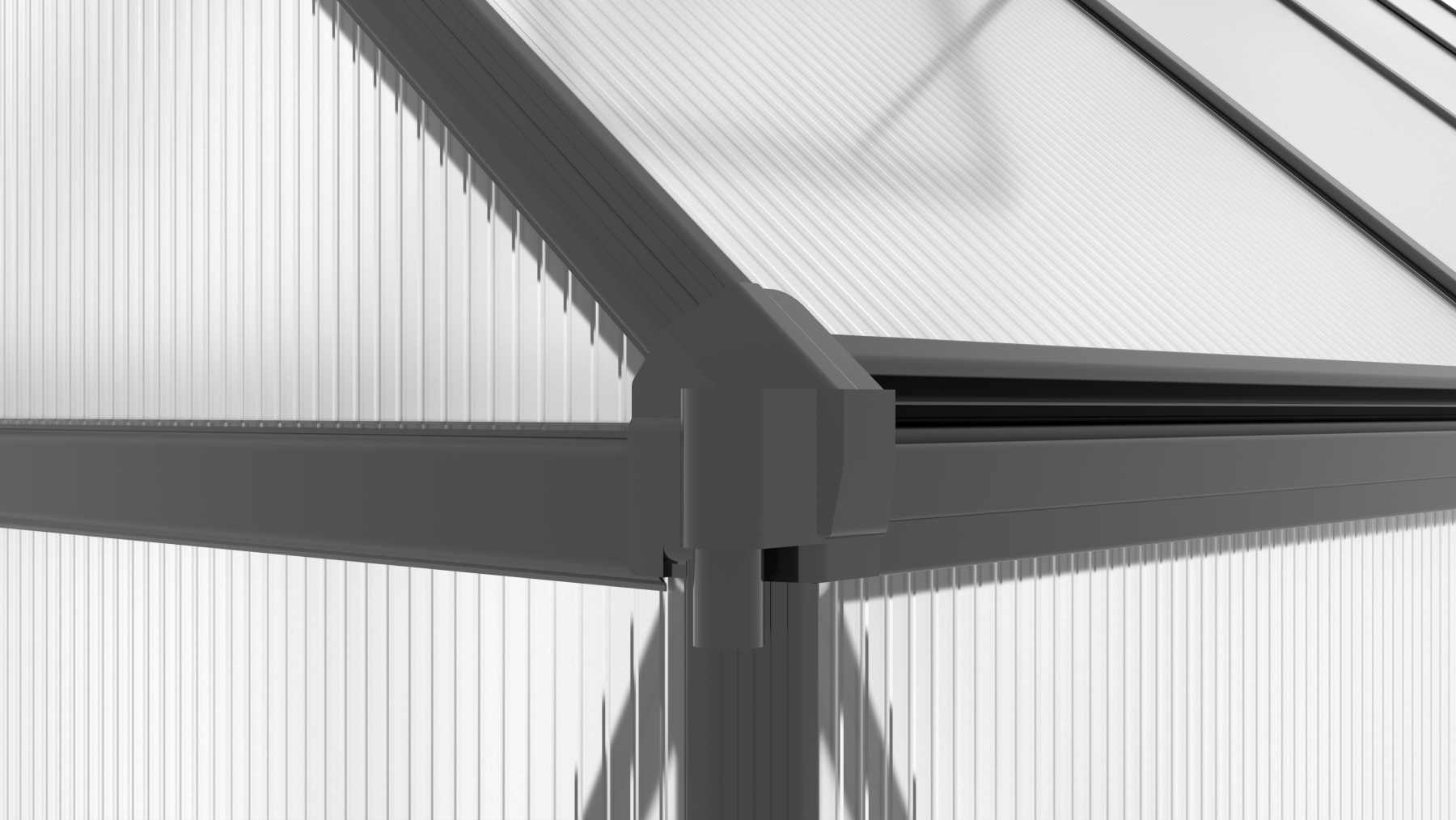 Skleníky řady SARANA patří do prémiové kategorie značkových skleníků od výrobce LANIT PLAST. Rámová konstrukce je vyrobena z eloxovaných hliníkových profilů, které zaručují dlouhou životnost a vysokou odolnost. Prosklení tvoří dvoustěnné komůrkové polykarbonátové desky o tloušťce 4 mm, které poskytují vynikající tepelně-izolační vlastnosti a optimální ochranu proti UV záření. Desky jsou pevně uchyceny do plochých i rohových H-profilů, čímž je zajištěna maximální stabilita a odolnost celé konstrukce. Skleník je dále vybaven uzavřenými bočními hranami polykarbonátu, které přispívají k jeho dlouhodobé trvanlivosti. Hlavní předností modelu jsou zesílené nosné profily, které výrazně zvyšují jeho pevnost a odolnost vůči povětrnostním podmínkám, jako je silný vítr a sněhové zatížení.