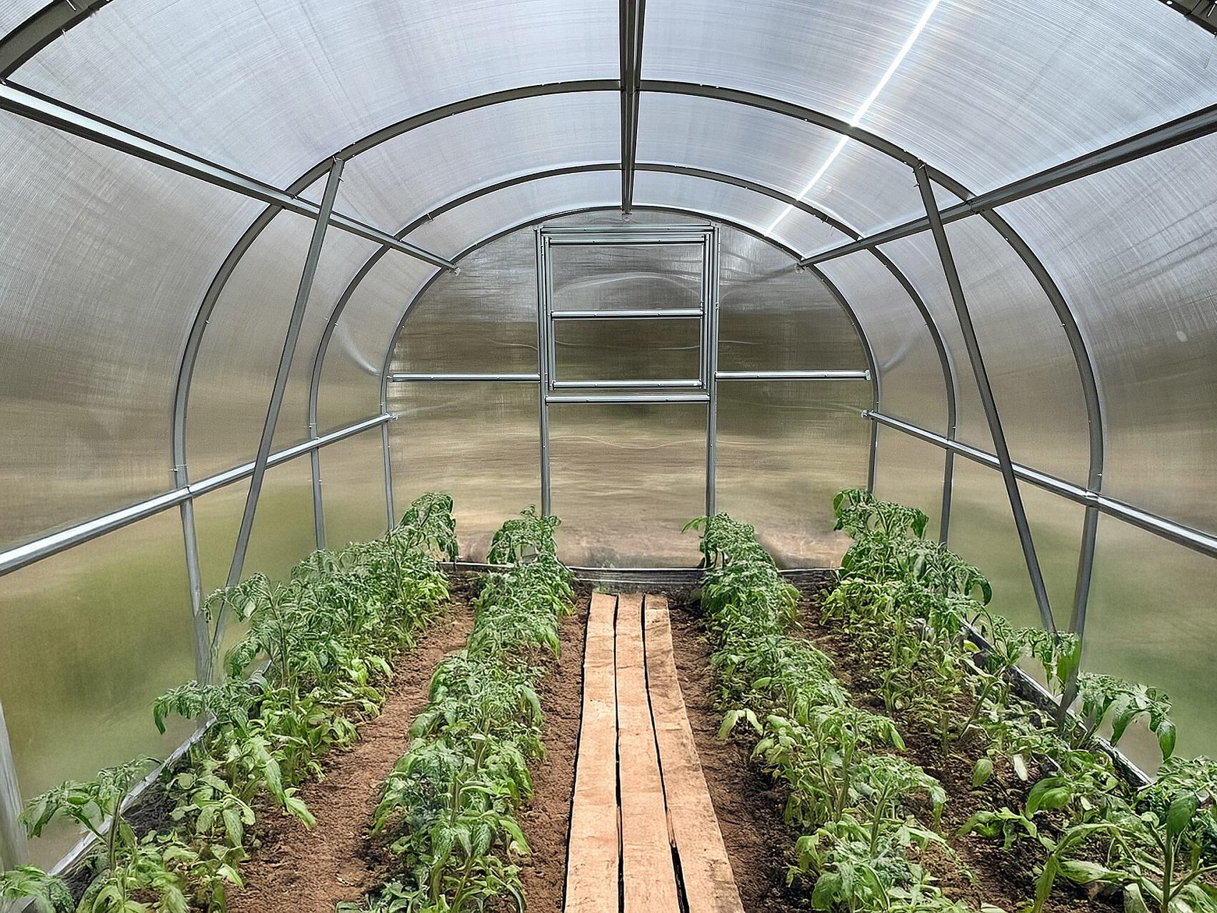 Konstrukce - konstrukce skleníku je sešroubovaná z pozinkovaných omega profilů síly 0,6 mm. Materiál profilů je galvanicky pozinkovaný. Jednotlivá žebra nosných oblouků jsou od sebe vzdálena 100 cm. Dvě podpěry na každém oblouku garantují vysokou únosnost celé konstrukce skleníku. Přední čelo skleníku má vestavěné jednokřídlé dělené dveře o světlosti 95 x 186 cm a na zadním čele je ventilační okno o rozměrech š 95 x v 90 cm. Pokud otevřete horní část dveří a zadní okno, zajistíte tím pohodlné větrání celého skleníku, aniž by do něj měly přístup děti nebo domácí zvířata. Obsahem dodávky každého skleníku je jedno střešní okno s manuálním ovládáním (otevřeno / zavřeno). K oknu doporučujeme dokoupit automatický otvírač, který otvírání a zavírání okna na základě teploty ve skleníku zařídí za Vás.