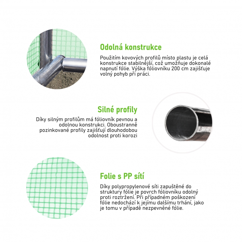 Zahradní fóliovník HomeGarden zelený 2,5x4m (10m2) je vyroben z vysoce kvalitních materiálů. Ocelová pozinkovaná konstrukce je doplněna plachtou z polyethylénu s UV filtrem UV-4. Zapuštěná polypropylenová síťka zvyšuje pevnost plachty a zabraňuje jejímu trhání. Boční stěny fóliovníku mají okna opatřená moskytiérou, která chrání před pronikáním škůdců a hmyzu. Okna zároveň slouží k ventilaci a lepší regulaci klimatu uvnitř fóliovníku. Vstup je dostatečně široký a snadno uzavíratelný pomocí zipů. Výška fóliovníku umožňuje komfortní provádění prací spojených s péčí o rostliny.