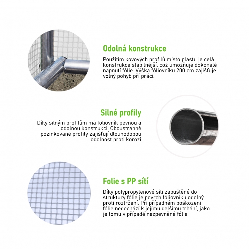 Naše konstrukce má průměr profilů 25mm a sílu stěny 0,7 až 0,9 mm. To je záruka, že Vám fóliovník vydrží i v nepříznivém počasí a to po dlouhou dobu. Žádné plastové díly - šroubované spoje !