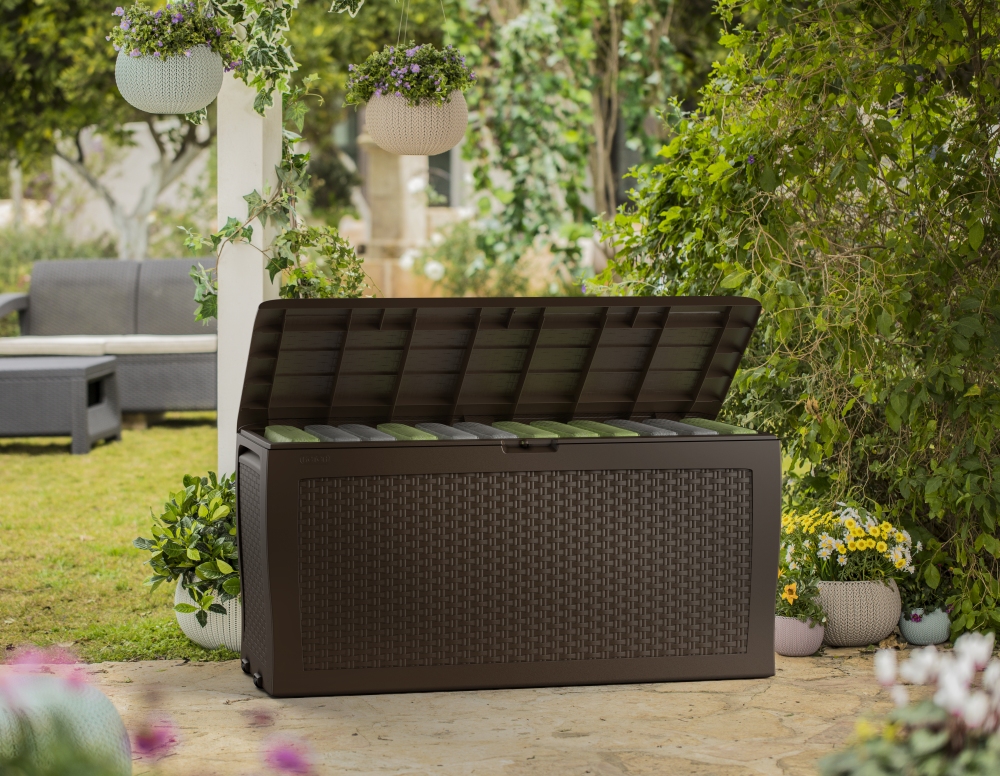 Zahradní úložný box Keter Samoa Rattan poslouží jako perfektní úložný prostor pro polštáře a ostatní doplňky. Struktura jeho povrchu imituje přírodní ratan a je odolná vůči povětrnostním podmínkám a UV záření bez nutnosti údržby. Snadná a rychlá montáž - není třeba žádných nástrojů, a velmi snadno se čistí.