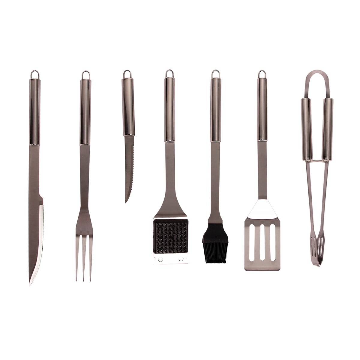 sada obsahuje nejenom nejpoužívanější grilovací nářadí, ale i nářadí na údržbu roštu– velký nůž, vidličku, malý zubatý nůž, kartáč na čištění grilu se škrabkou, štětec na potírání-mašlovačku, obracečku a kleště
