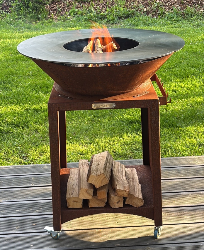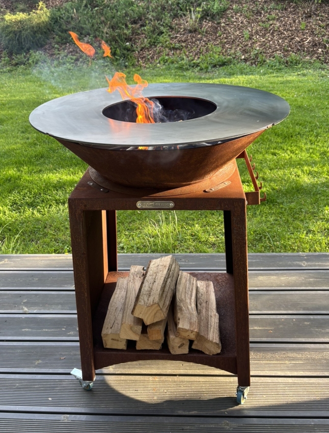 Zahradní ohniště, včetně podstavce vyrobeného ze speciálně upravené oceli CORTEN pro uložení dřeva, je doplněno grilovací deskou o síle 5mm.