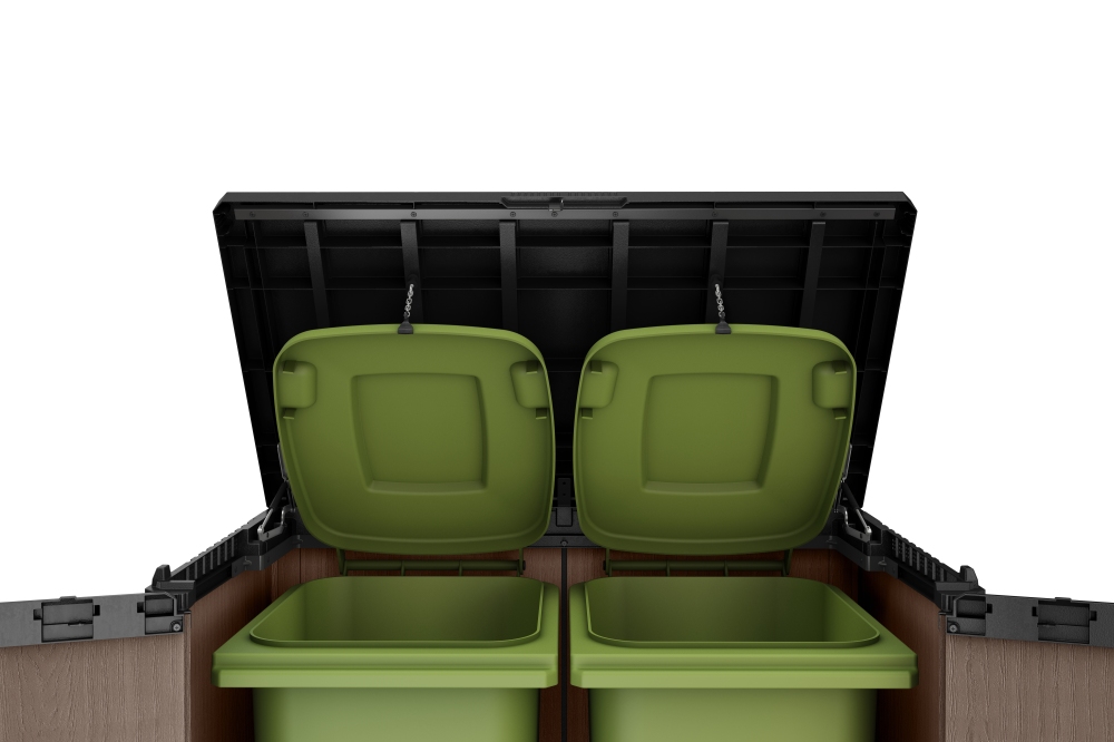 Do boxu nainstalujete v případě potřeby police (nejsou součástí balení). Lze použít dřevěné prkno, které můžete přichytit za úchyty, které najdete v balení. Do boxu se vejdou dvě popelnice, každá o objemu 240 l. Pokud je uchováváte v boxu, můžete namontovat řetízky s háčky, abyste uchytili víka popelnice k jeho horní části. Zjednodušíte si jejich otevírání a zavírání.