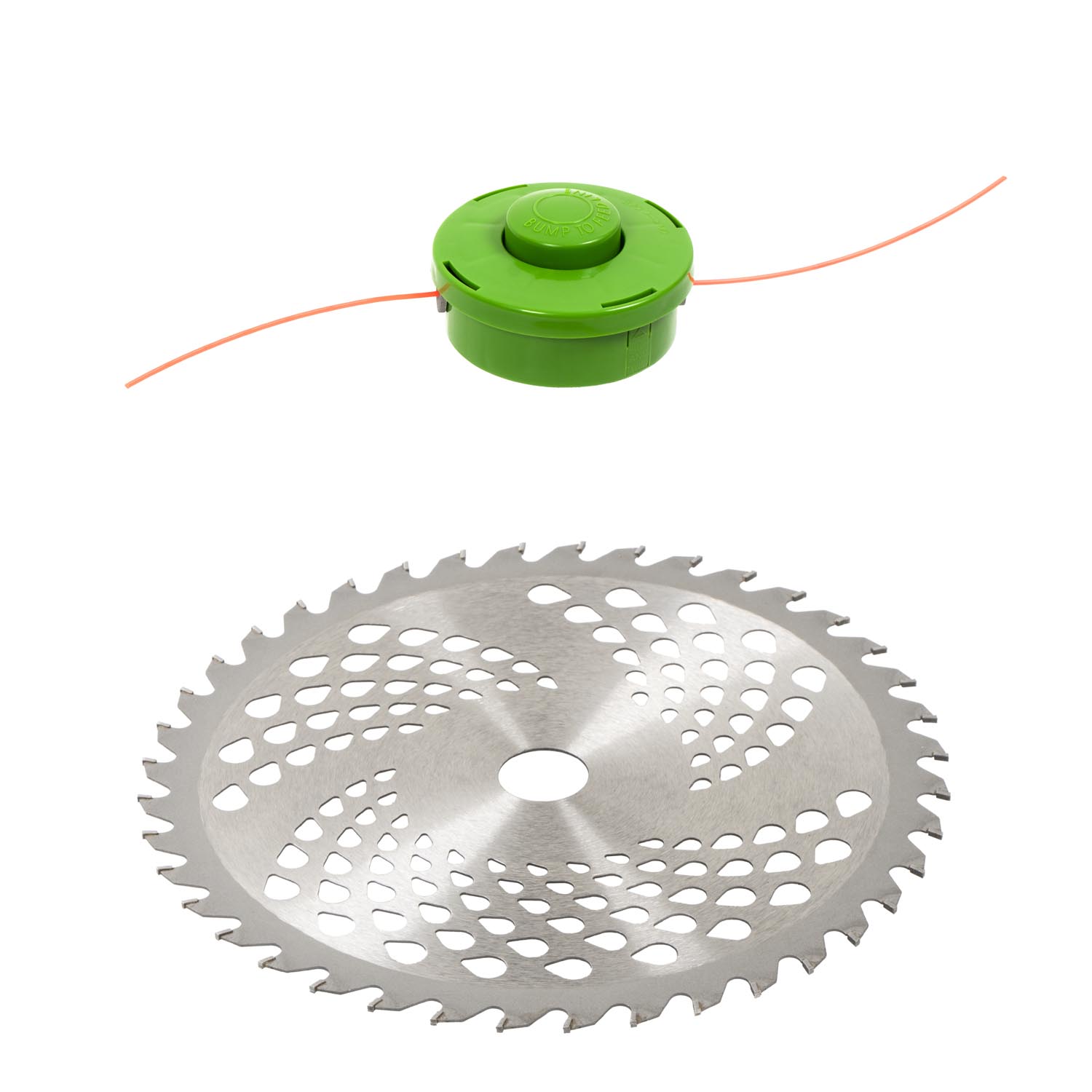 Všestrannost křovinořezu: Možnost použití strunové hlavy (záběr 420 mm) i pilového kotouče pro různé typy vegetace.