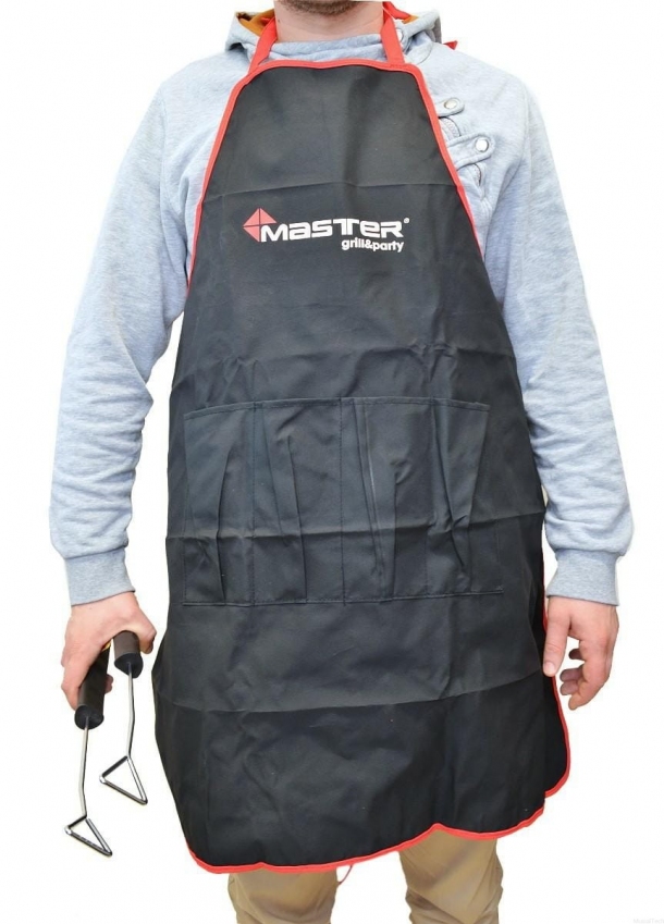 Grilovací zástěra Master Grill s dělenou kapsou na příslušenství chrání oblečení před nechtěným zašpiněním při grilování. S oranžovým lemováním a vázáním kolem těla a krku.
