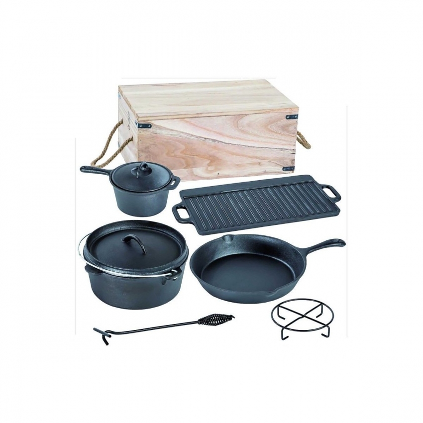 Se 7dílnou litinovou sadou od Activa skládající se z holandského kotlíku, vysoké pánve s poklicí, pánve, plotýnky a stojánku lze připravovat pokrmy téměř kdekoli podle libosti na otevřeném ohni nebo na uhlíkách . Rozmanitost nádobí a jeho velikost dodávají soupravě multifunkční a komplexní charakter.