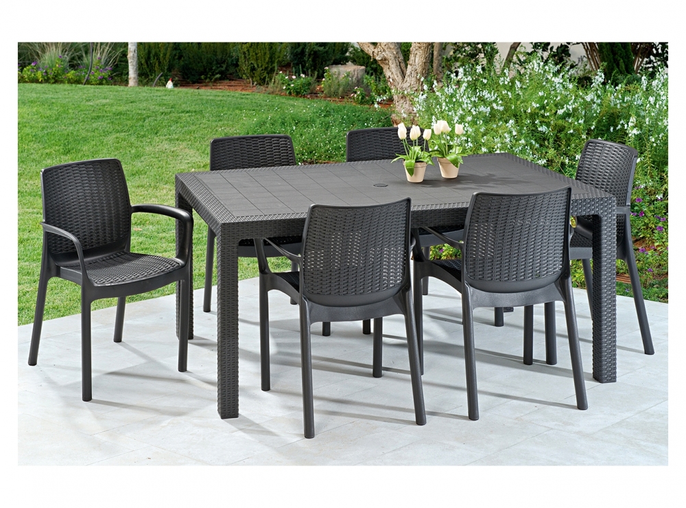 Zahradní set BALI/MELODY Graphite je vyroben z vysoce kvalitního polypropylenu s přírodní strukturou ratanu. Set se skládá ze 6 pohodlných židlí a mimořádně funkčního velkého stolu. Deska stolu má otvor pro deštník, který lze zavřít zátkou. Nábytek je odolný vůči měnícím se povětrnostním podmínkám. Židle mají zespod na nohou protiskluzovou úpravu, která brání smýkání na mokrém a vlhkém povrchu. Židle lze také na sebe naskládat pro pohodlné uskladnění šetřící místo.