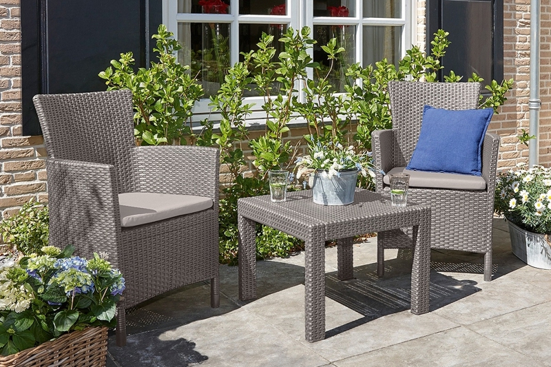 Komfortní komplet zahradního nábytku z vysoce kvalitního plastu v imitaci přírodního ratanu. Pohodlná křesla s vysokou opěrkou jsou doplněna stylovým kávovým stolkem. Křesla jsou doplněna měkkými polstrovanými sedáky. Sestava je pro své rozměry vhodná na balkóny nebo menší terasy.