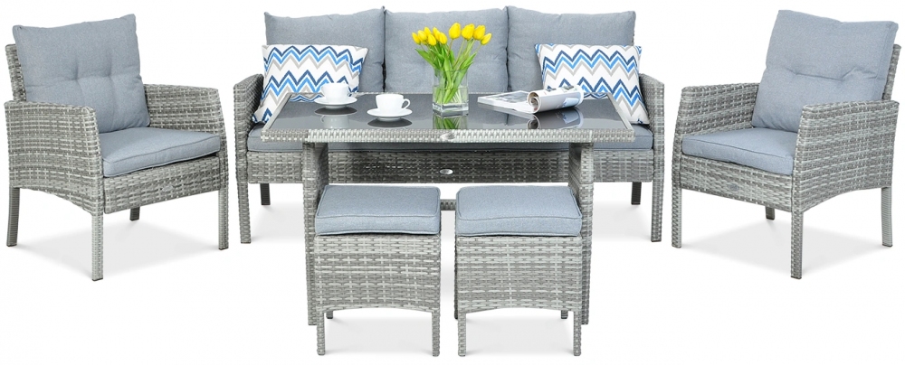 Zahradní set CORTINA je tvořen z velkého jídelního stolu obdélníkového tvaru s deskou z tvrzeného skla. 3-místná pohovka, která ve spojení s pohodlnými křesly a taburety poskytují prostot až pro 7 osob. CORTINA Grey je vyroben z plochého technoratanového vlákna v odstínech šedé. Celá sada se vyznačuje použitím vysoce kvalitních materiálů. Rám je vyroben z pevné oceli ošetřené práškovou barvou která zajišťuje správnou tuhost konstrukce a odolnost proti korozi. Použité materiály jsou odolné vůči atmosferickým vlivům jako je déšť nebo silné sluneční záření. Nábytek CORTINA s jedinečným vzhledem nabízí zcela nový estetický a funkční zážitek. Tento komplet je ideální pro zahradu, terasu nebo do interiéru.