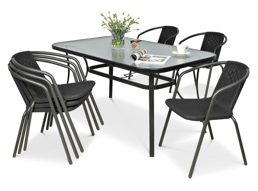 Pěkná a funkční jídelní sestava SIMPLE 150/6 Graphite vyrobená z vysoce kvalitních materiálů. Je to skvělou kombinací pevné konstrukce, pohodlí pro uživatele a velmi příznivé ceny. Prostorný stůl 150cm a 6 pohodlných křesel to je zahradní set SIMPLE. Pokud hledáte úhledný a levný set pro vaši zahradu, terasu nebo pozemek, bude tento set skvělým řešením. Stůl s deskou z tvrzeného skla a otvorem pro slunečník doplňuje 6 stohovatelných židlí s opěrkou a sedákem v imitaci přírodního ratanu.