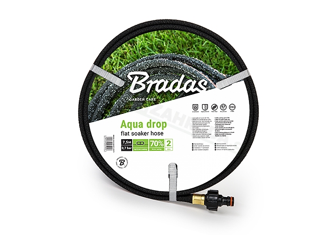 Plochá hadice AQUA DROP zajišťuje přesné a vysoce efektivní zavlažování. AQUA-DROP - je vyrobená ze 100% recyklované kvalitní gumy, která zajišťuje rovnoměrné pronikání vody po celém povrchu. Představuje úsporu vody až o 70%. Hadice je osazena rychlospojkami pro snadné připojení. Hadice AQUA DROP může být umístěna pod mulčovací kůrou nebo pod zeminou v hloubce až 20 cm. Hadice je ideálním řešením pro přesné a efektivní zavlažování rostlin.
