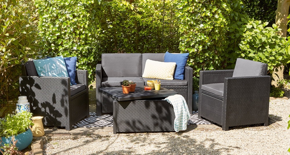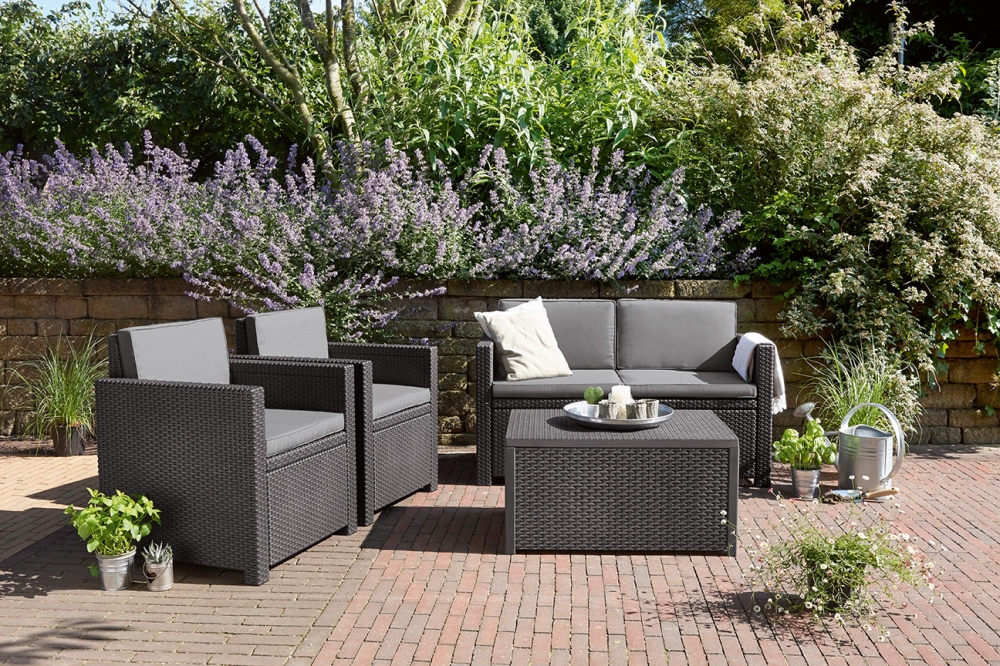 Zahradní set MONACO Grey je pohodlná a elegantní sada nábytku, která zahrnuje: dvě křesla, pohovku a obdélníkový stůl, který poslouží i jako úložný box. Sada se vyznačuje vysokým komfortem a příjemným designem imitující strukturu přírodního ratanu. Trvalý materiál zaručuje odolnost proti nežádoucím vlivům povětrnostních podmínek i UV záření.
