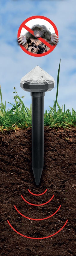 Kulatá solární plašička účinně odpuzuje krtky, myši, hraboše, rejsky i zmije pomocí vibrací a zvuku s proměnnou frekvencí od 400 do 1000 Hz v 17sekundových intervalech. Dosah odpuzovače je do 15 m a neškodí domácím zvířatům. Na vrchní části je vybaven bílou LED diodou, která se spouští díky senzoru soumraku. Díky vestavěné baterii na solární energii ji není potřeba připojit k elektrickému napájení - nabíjení přes sluneční paprsky (pouze v režimu ON).