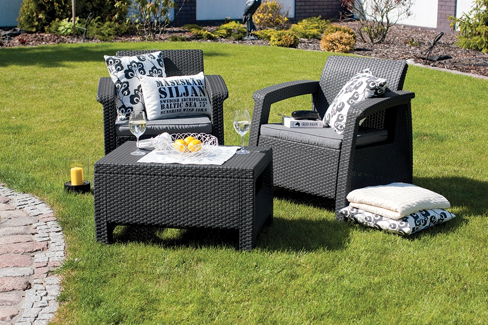 Souprava Corfu Weekend je vyrobena z vysoce kvalitního polypropylenu, který je odolný proti nepřízni počasí, dešti i UV záření a vyniká vysokou životností.