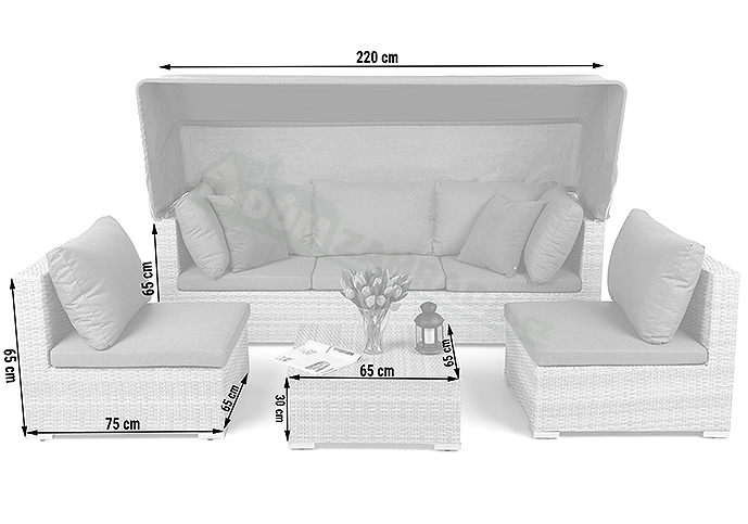- sada obsahuje: sofa se sklopnou stínící střechou, 2 moduly pro sezení a kávový stolek