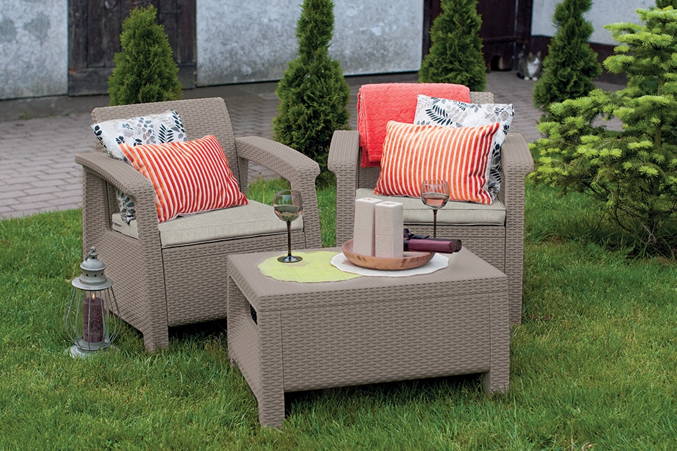 Souprava Corfu Weekend je vyrobena z vysoce kvalitního polypropylenu, který je odolný proti nepřízni počasí, dešti i UV záření a vyniká vysokou životností.