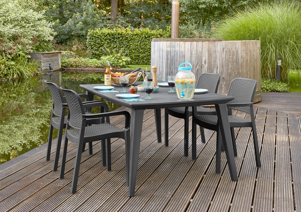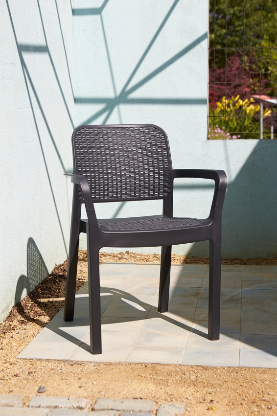 Zahradní židle Samanna kombinuje robustní konstrukci a klasickou eleganci. Pohodlné, správně profilované opěradlo s ratanovým vzhledem a stabilní područky zajišťují optimální komfort sezení. Židle jsou odolné proti poškození, dlouhodobému vystavení povětrnostním vlivům a UV záření.