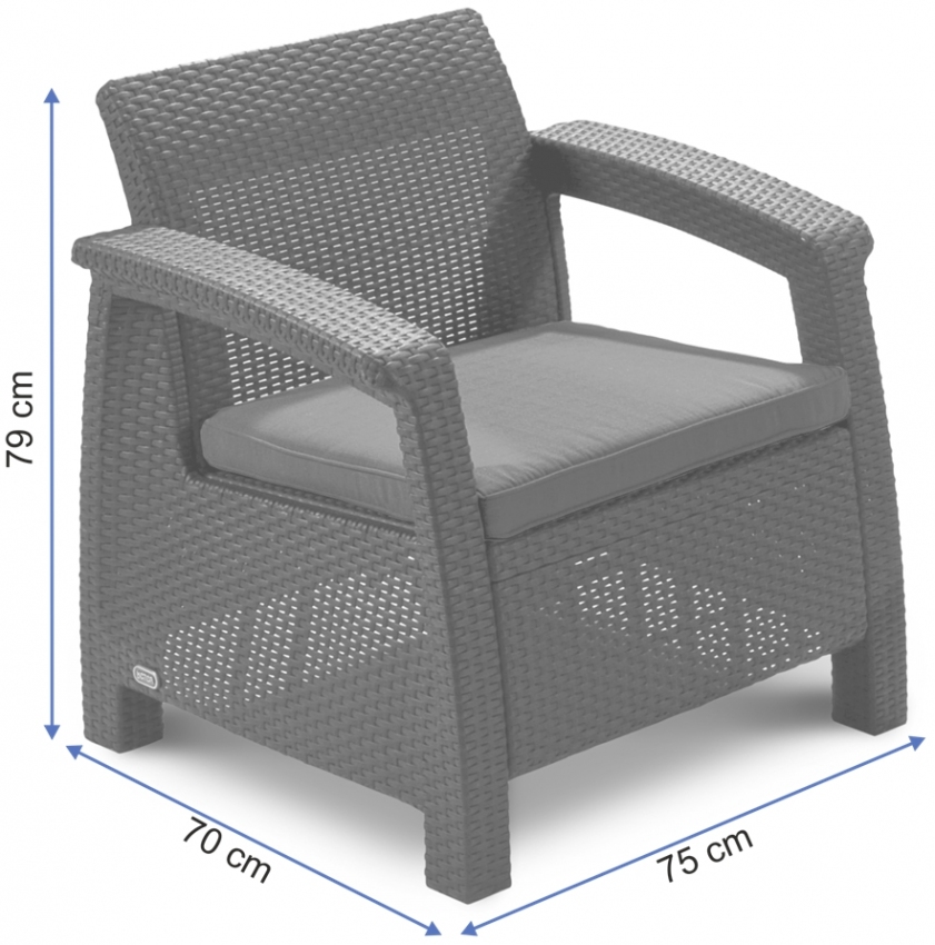 Zahradní sada Corfu II DUO je určena pro ty, kteří se chtějí na své zahradě, balkónu či terase pohodlně usadit. Křesla jsou vyrobena z plastu imitující strukturu přírodního ratanu, který je velmi odolný vůči povětrnostním podmínkám a nevyžaduje žádnou údržbu. K jeho čištění postačí jen voda nebo jemné čisticí prostředky. Polštáře se díky zipu dají snadno vyndat z povlaku, který lze prát.