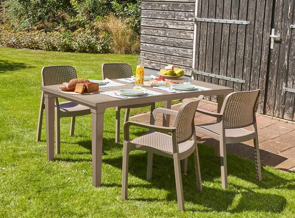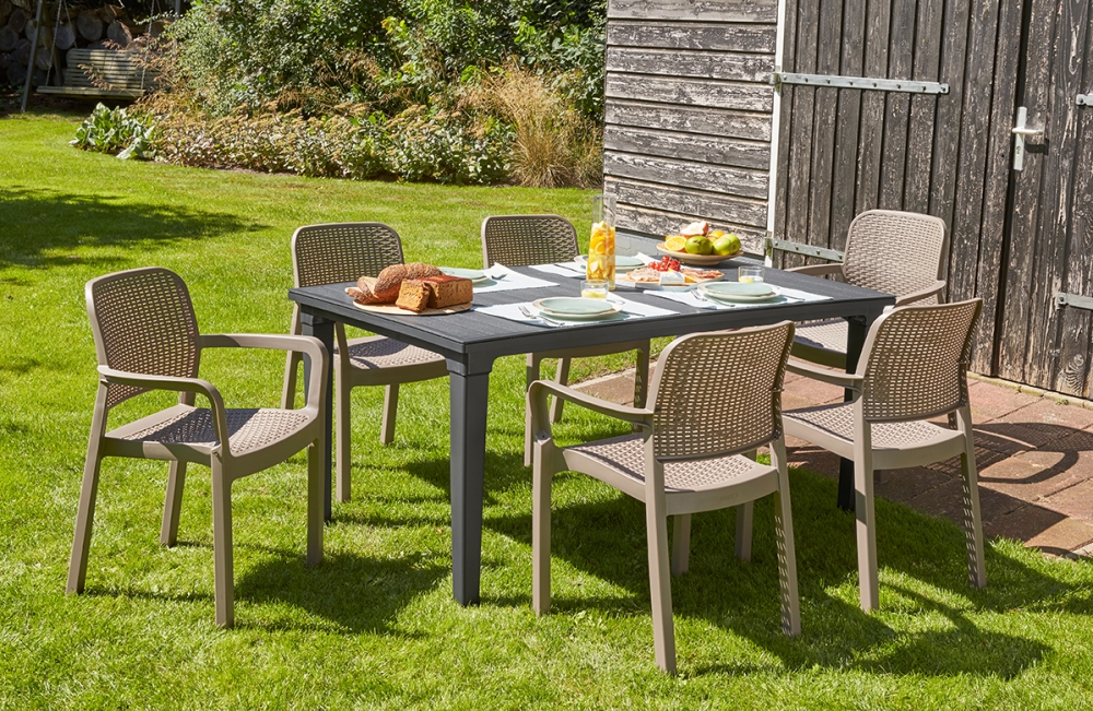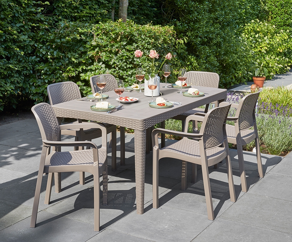 Zahradní židle Samanna kombinuje robustní konstrukci a klasickou eleganci. Pohodlné, správně profilované opěradlo s ratanovým vzhledem a stabilní područky zajišťují optimální komfort sezení. Židle jsou odolné proti poškození, dlouhodobému vystavení povětrnostním vlivům a UV záření.